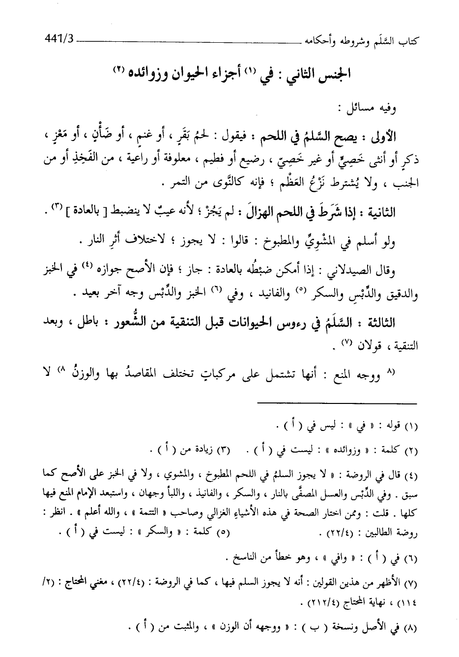 الأولى يَصح السّلم فِي اللَّحْم فَيَقُول لحم بقر أَو غنم أَو ضَأْن أَو معز ذكر أَو أُنْثَى خصى أَو غير خصي رَضِيع أَو فطيم معلوفة أَو راعية من الفخد أَو من الْجنب وَلَا يشْتَرط فَإِنَّهُ كالنوى من التَّمْر