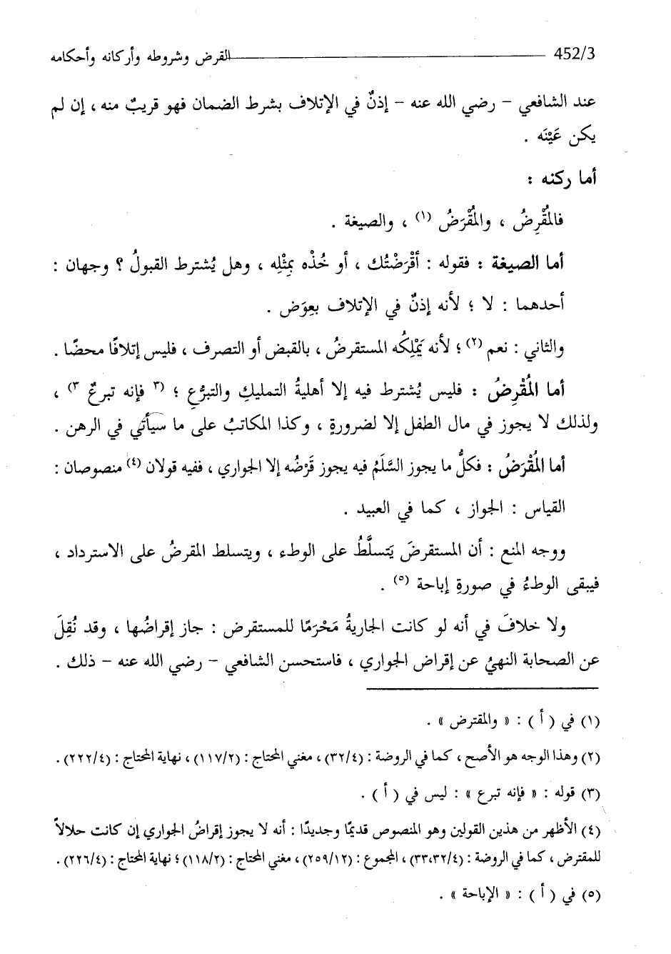 أما الْمقْرض فَكل مَا يجوز السّلم فِيهِ ويتسلط قرضه الا الْجَوَارِي فَفِيهِ قَولَانِ منصوصان
