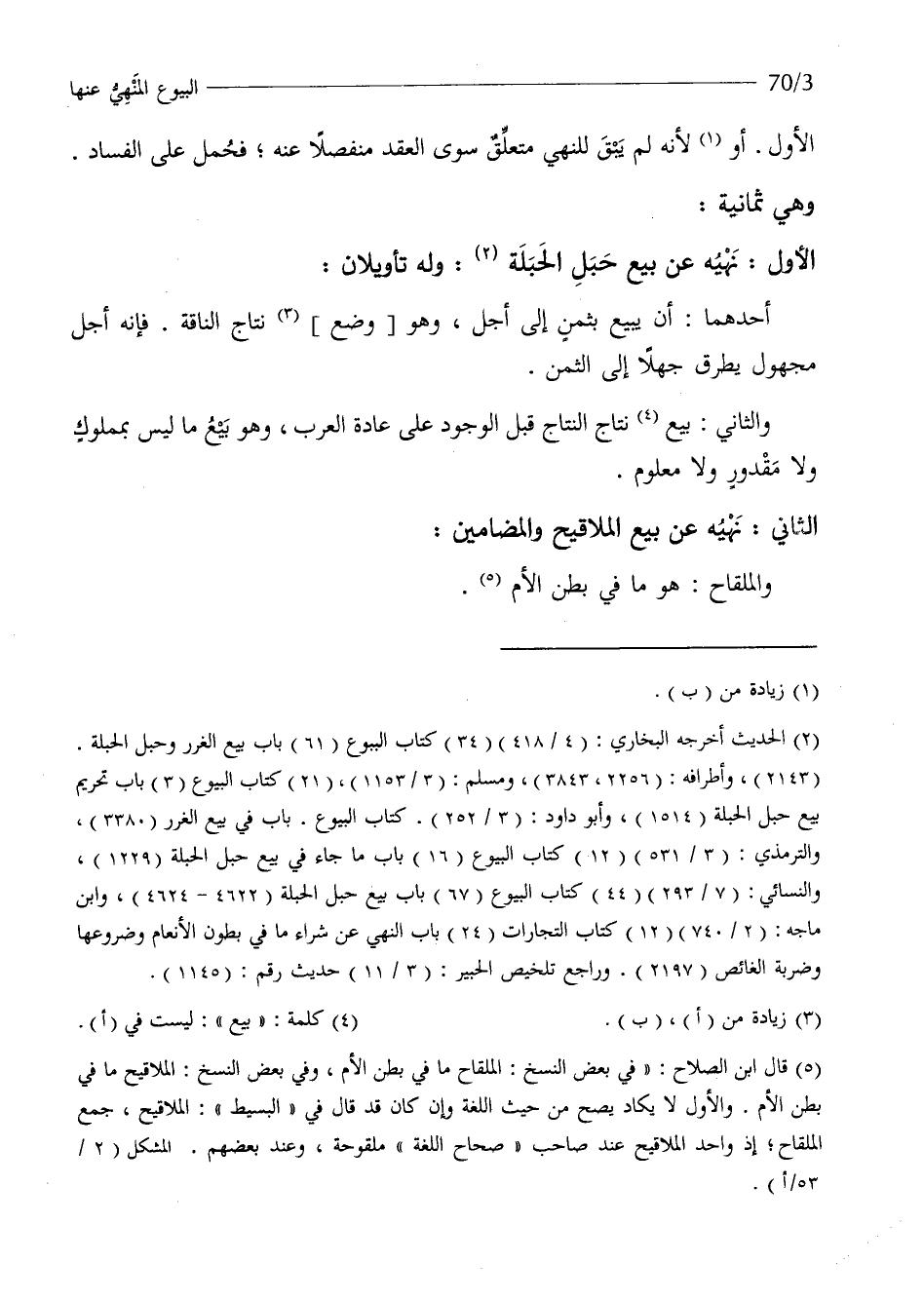 الأول نَهْيه عَن بيع حَبل الحبلة وَله تَأْوِيلَانِ