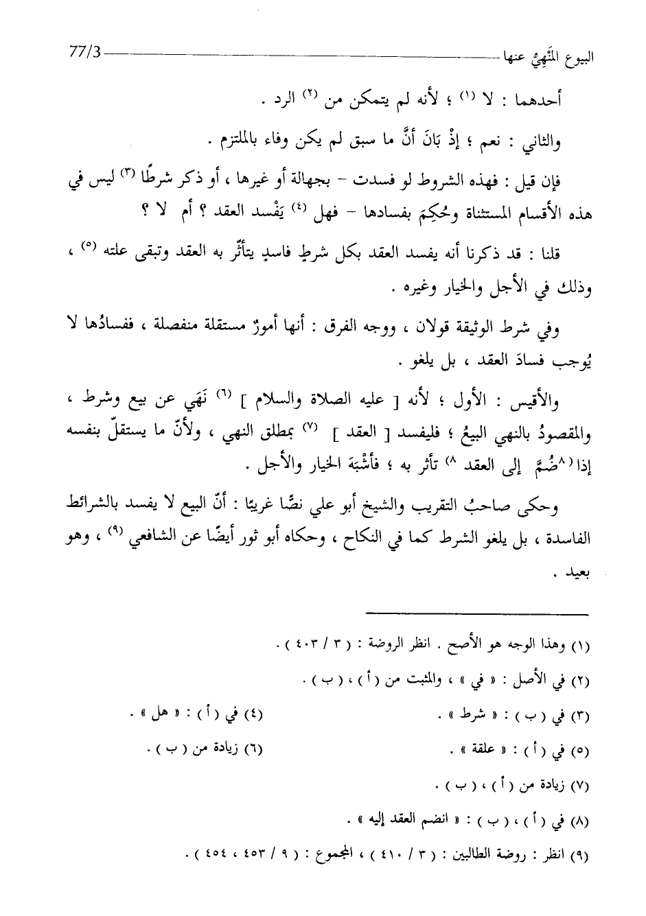 وَحكى صَاحب التَّقْرِيب وَالشَّيْخ أَبُو عَليّ نصا غَرِيبا أَن البيع لَا يفْسد بالشرائط الْفَاسِدَة بل يَلْغُو الشَّرْط كَمَا فِي النِّكَاح وَحَكَاهُ أَبُو ثَوْر أَيْضا عَن الشَّافِعِي وَهُوَ بعيدَة