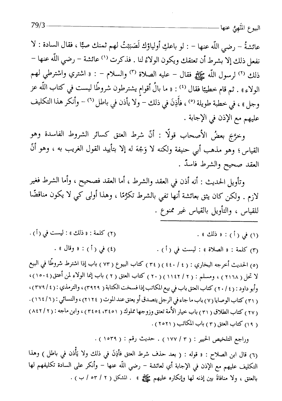 عَائِشَة رَضِي الله عَنْهَا لَو باعك أولياؤك لصببت لَهُم ثمنك صبا فَقَالَ السَّادة لَا نَفْعل ذَلِك إِلَّا بِشَرْط أَن تعتقك وَيكون الْوَلَاء لنا فَذكرت عَائِشَة رَضِي الله عَنْهَا ذَلِك لرَسُول الله صلى الله عَلَيْهِ وَسلم فَقَالَ عَلَيْهِ الصَّلَاة وَالسَّلَام اشْترِي واشترطي لَهُم الْوَلَاء ثمَّ قَامَ خَطِيبًا فَقَالَ مَا بَال أَقوام يشترطون شُرُوطًا لَيست فِي كتاب الله عز وَجل فِي خطْبَة طَوِيلَة فَأذن فِي ذَلِك وَلَا يَأْذَن فِي بَاطِل وَأنكر هَذَا التَّكْلِيف عَلَيْهِم مَعَ الْإِذْن فِي الْإِجَابَة