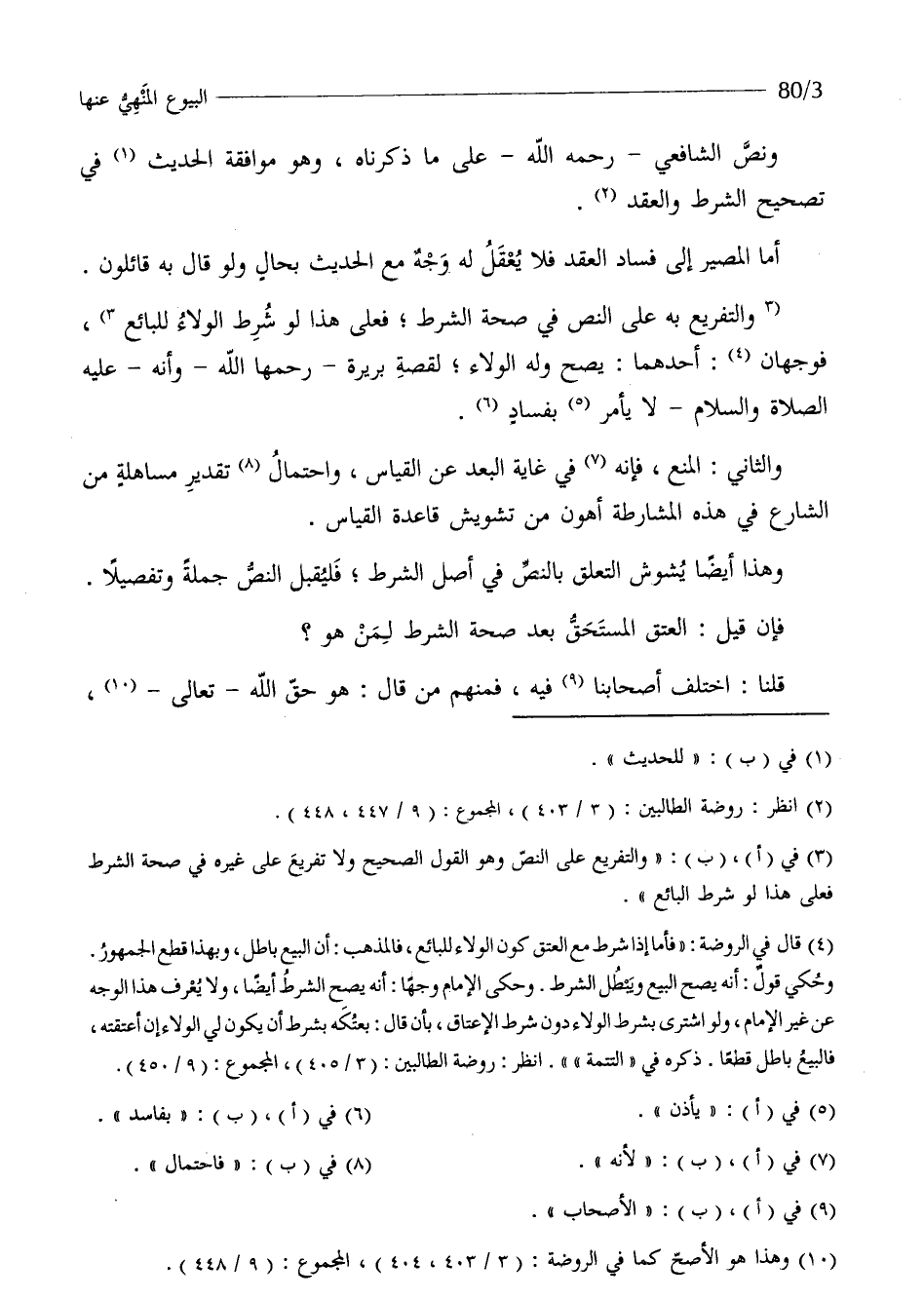وَنَصّ الشَّافِعِي رَحمَه الله على مَا ذَكرْنَاهُ وَهُوَ مُوَافقَة الحَدِيث فِي تَصْحِيح الشَّرْط وَالْعقد