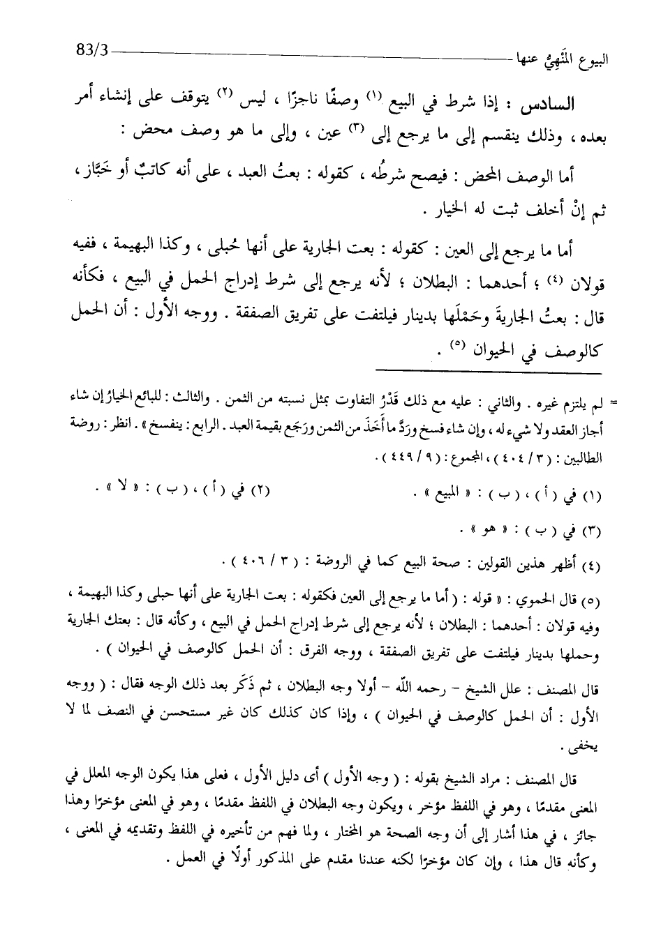 السَّادِس إِذا شَرط فِي البيع وَصفا ناجزا لَيْسَ يتَوَقَّف على إنْشَاء أَمر بعده وَذَلِكَ يَنْقَسِم إِلَى مَا يرجع إِلَى عين والى مَا هُوَ وصف مَحْض