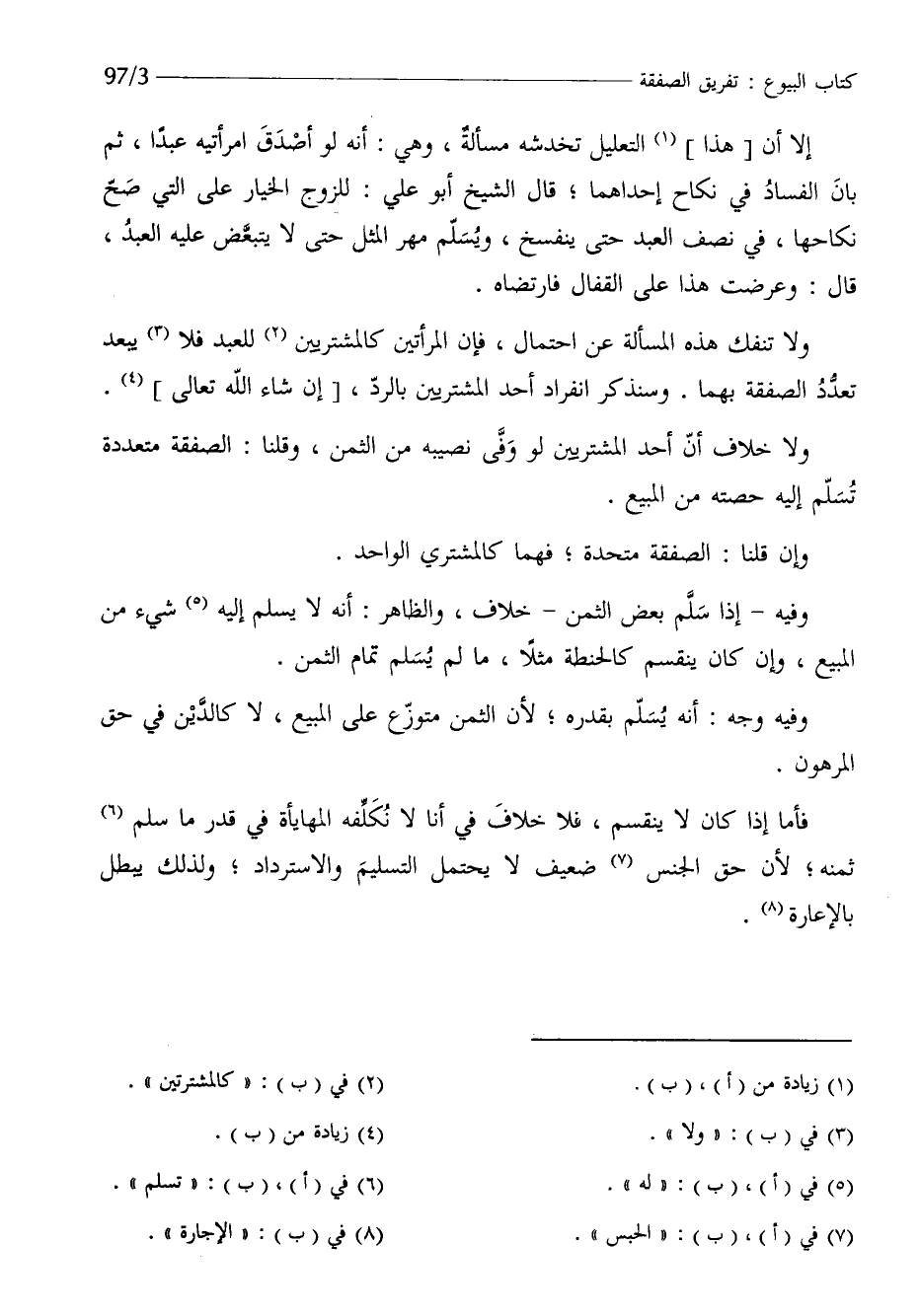 إِلَّا أَن هَذَا التَّعْلِيل تخدشه مَسْأَلَة وَهِي انه لَو اصدق امرأتيه عبدا ثمَّ بَان الْفساد فِي نِكَاح إِحْدَاهمَا قَالَ الشَّيْخ أَبُو عَليّ للزَّوْج الْخِيَار على الَّتِي صَحَّ نِكَاحهَا فِي نصف العَبْد حَتَّى يَنْفَسِخ وَيسلم مهر الْمثل حَتَّى لَا يَتَبَعَّض عَلَيْهِ العَبْد قَالَ وَعرضت هَذَا على الْقفال فارتضاه