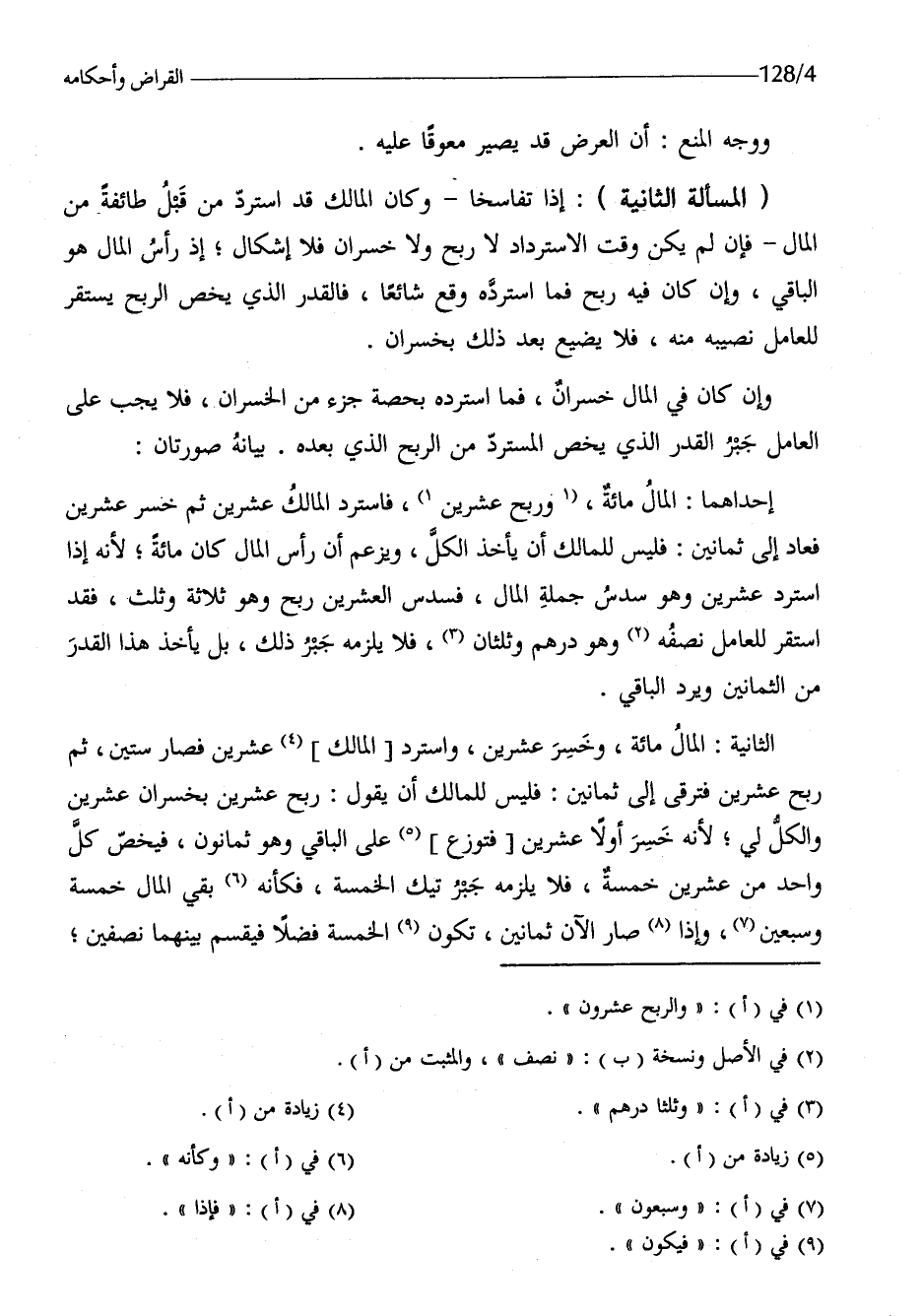 إِحْدَاهمَا المَال مائَة وَربح عشْرين فاسترد الْمَالِك عشْرين ثمَّ خسر عشْرين فَعَاد إِلَى ثَمَانِينَ فَلَيْسَ للْمَالِك أَن يَأْخُذ الْكل وَيَزْعُم أَن رَأس المَال كَانَ مائَة لِأَنَّهُ إِذا اسْتردَّ عشْرين وَهُوَ سدس جملَة المَال فسدس الْعشْرين ربح وَهُوَ ثَلَاثَة وَثلث فقد اسْتَقر لِلْعَامِلِ نصفه وَهُوَ دِرْهَم وَثُلُثَانِ فَلَا يلْزمه جبر ذَلِك بل يَأْخُذ هَذَا الْقدر من الثَّمَانِينَ وَيرد الْبَاقِي