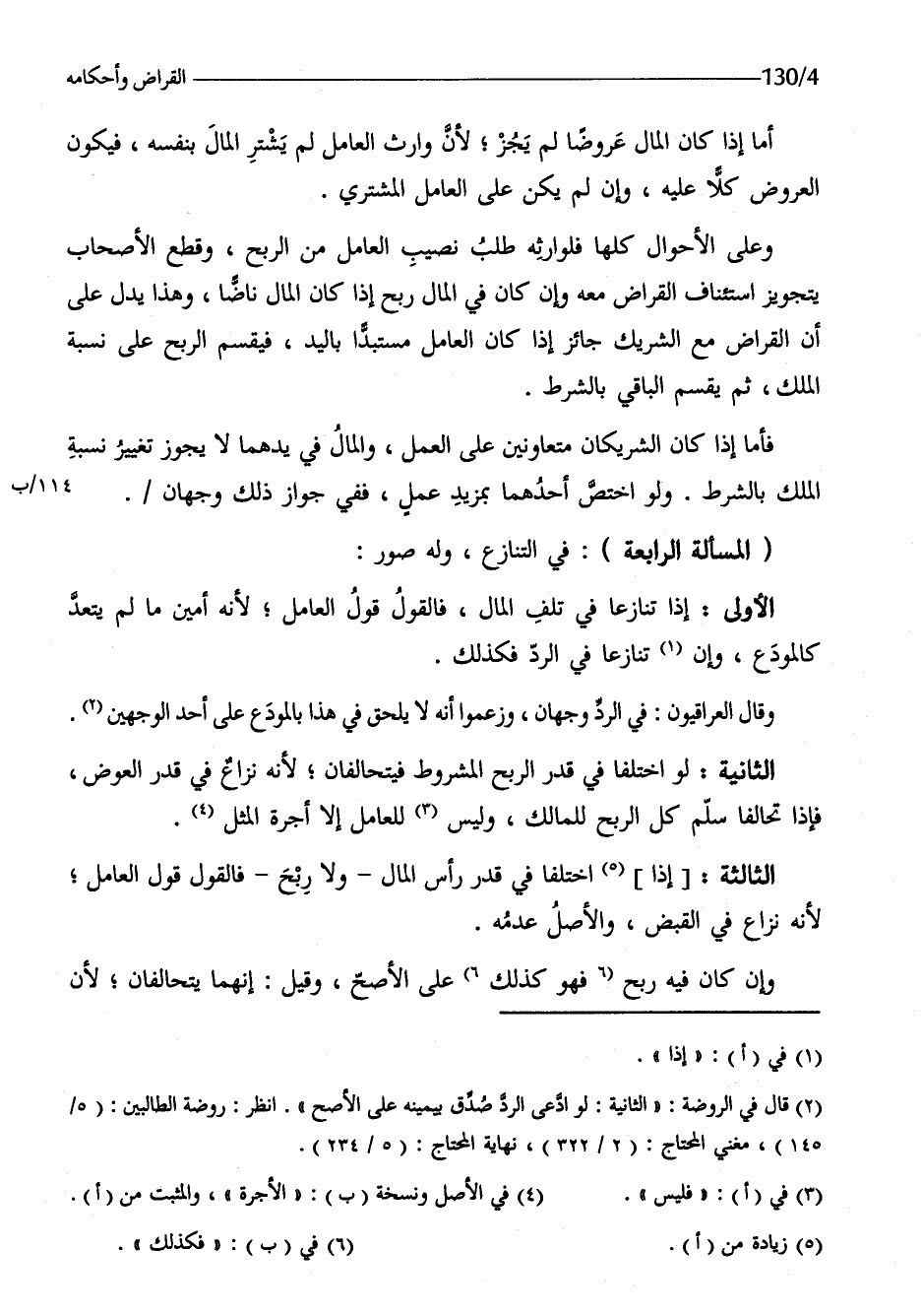 وعَلى الْأَحْوَال كلهَا فلوارثه طلب نصيب الْعَامِل من الرِّبْح وَقطع الْأَصْحَاب يتجويز اسْتِئْنَاف الْقَرَاض مَعَه وَإِن كَانَ فِي المَال ربح إِذا كَانَ المَال ناضا وَهَذَا يدل على أَن الْقَرَاض مَعَ الشَّرِيك جَائِز إِذا كَانَ الْعَامِل مستبدا بِالْيَدِ فَيقسم الرِّبْح على نِسْبَة الْملك ثمَّ يقسم الْبَاقِي بِالشّرطِ