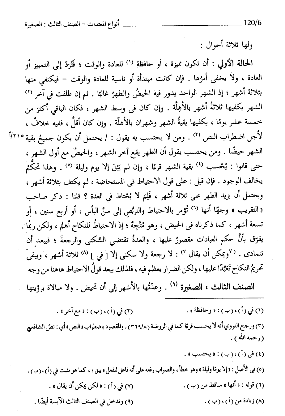الْحَالة الأولى أَن كَون مُمَيزَة أَو حافظة للْعَادَة وَالْوَقْت فَترد إِلَى التَّمْيِيز أَو الْعَادة وَلَا يخفى أمرهَا فَإِن كَانَت مُبتَدأَة أَو ناسية للْعَادَة وَالْوَقْت فيكتفي مِنْهَا بِثَلَاثَة أشهر إِذْ الشَّهْر الْوَاحِد يَدُور فِيهِ الْحيض وَالطُّهْر غَالِبا ثمَّ إِن طلقت فِي آخر الشَّهْر يكفيها ثَلَاثَة أشهر بِالْأَهِلَّةِ وَإِن كَانَ فِي وسط الشَّهْر فَكَانَ الْبَاقِي أَكثر من خَمْسَة عشر يَوْمًا يكفيها بَقِيَّة الشَّهْر وشهران بِالْأَهِلَّةِ وَإِن كَانَ أقل فَفِيهِ خلاف لأجل اضْطِرَاب النَّص وَمن لَا يحْتَسب بِهِ يَقُول يحْتَمل أَن يكون جَمِيع بَقِيَّة الشَّهْر حيضا وَمن يحْتَسب يَقُول أَن الطُّهْر يَقع آخر الشَّهْر وَالْحيض مَعَ أول الشَّهْر حَتَّى قَالُوا يحْسب بَقِيَّة الشَّهْر قرءا وَإِن لم يبْق إِلَّا يَوْم وَلَيْلَة وَهَذَا تحكم يُخَالف الْوُجُود فَإِن قيل على قَول الإحتياط فِي الْمُسْتَحَاضَة لم يكتف بِثَلَاثَة أشهر وَيحْتَمل أَن يزِيد الطُّهْر على ثَلَاثَة أشهر فَلم لَا يحْتَاط فِي الْعدة قُلْنَا ذكر صَاحب التَّقْرِيب وَجها أَنَّهَا تُؤمر بالإحتياط والتربص إِلَى سنّ الْيَأْس أَو أَربع سِنِين أَو تِسْعَة أشهر كَمَا ذَكرْنَاهُ فِي الْحيض وَهُوَ مُتَّجه إِذْ الِاحْتِيَاط للنِّكَاح أهم وَلَكِن رُبمَا يفرق بِأَن حكم الْعِبَادَات مَقْصُور عَلَيْهَا وَالْعدة تَقْتَضِي السُّكْنَى وَالرَّجْعَة فيبعد أَن تتمادى وَيُمكن أَن يُقَال لَا رَجْعَة وَلَا سُكْنى إِلَّا فِي ثَلَاثَة أشهر وَيبقى تَحْرِيم النِّكَاح تعبدا عَلَيْهَا وَلَكِن الضرار يعظم فِيهِ فَلذَلِك يبعد قَول الإحتياط هَا هُنَا من وَجه