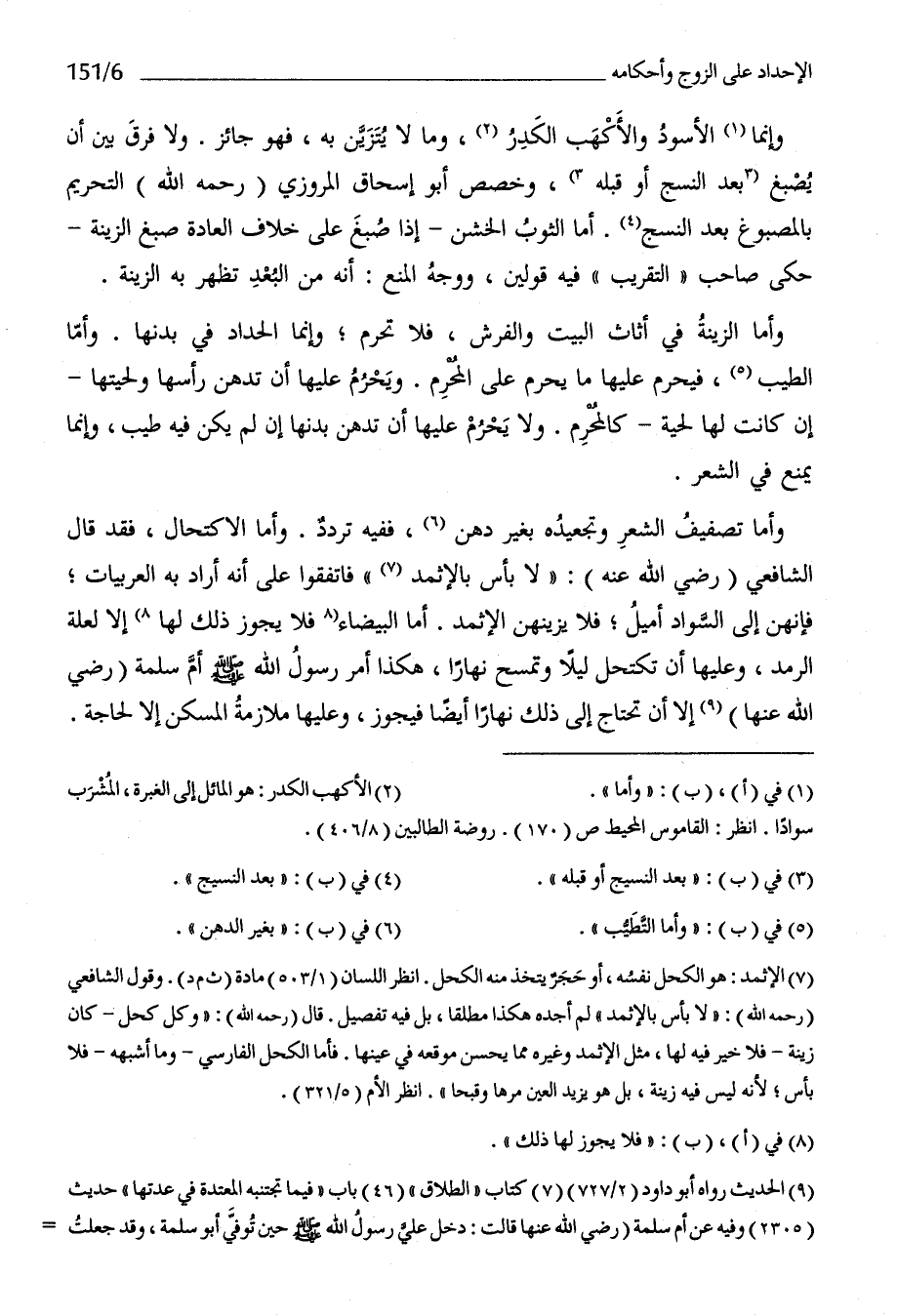 وَأما تصفيف الشّعْر وتجعيده بِغَيْر دهن فَفِيهِ تردد وَأما الإكتحال فقد قَالَ الشَّافِعِي رَضِي الله عَنهُ لَا بَأْس بالإثمد فاتفقوا على أَنه أَرَادَ بِهِ العربيات فَإِنَّهُنَّ إِلَى السوَاد أميل فَلَا يزينهن الإثمد أما الْبَيْضَاء فَلَا يجوز ذَلِك لَهَا إِلَّا لعِلَّة الرمد وَعَلَيْهَا أَن تكتحل لَيْلًا وتمسح نَهَارا هَكَذَا أَمر رَسُول الله صلى الله عَلَيْهِ وَسلم أم سَلمَة رَضِي الله عَنْهَا إِلَّا أَن تحْتَاج إِلَى ذَلِك نَهَارا أَيْضا فَيجوز وَعَلَيْهَا مُلَازمَة الْمسكن إِلَّا لحَاجَة