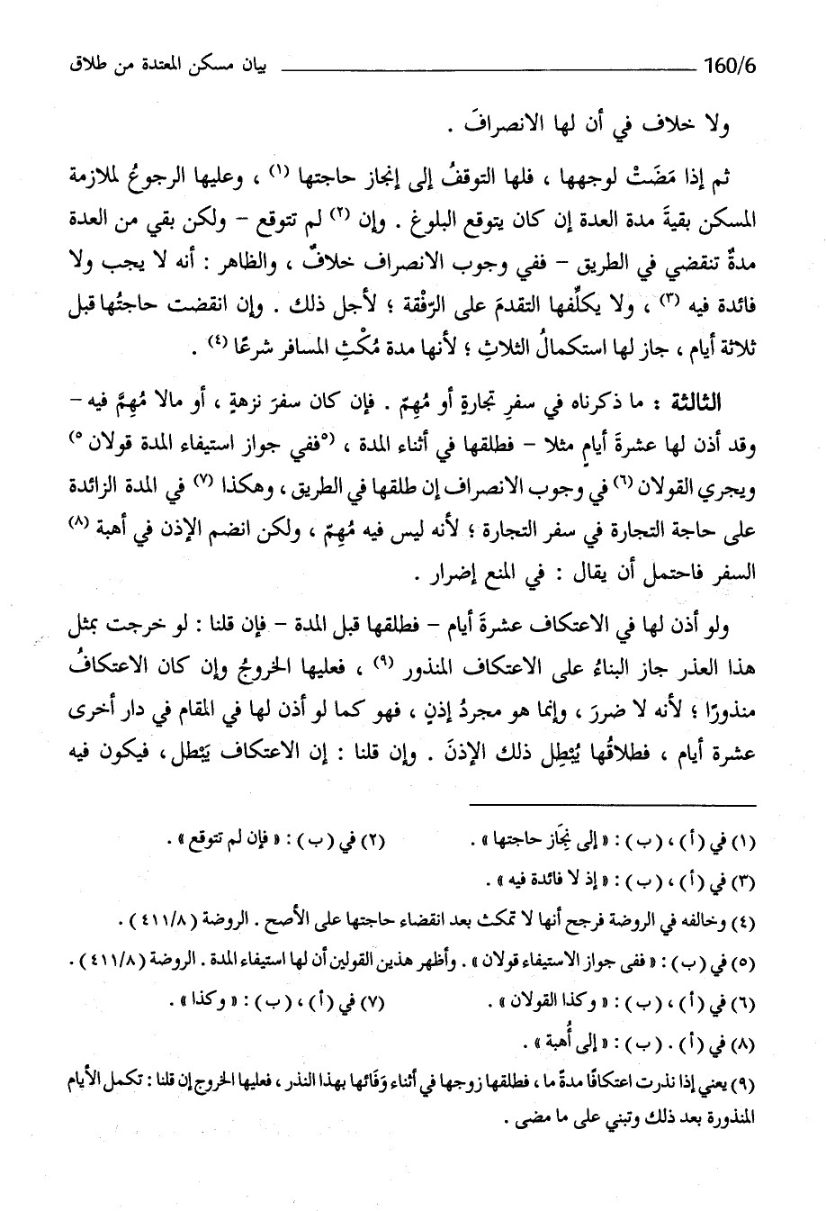 الثَّالِثَة مَا ذَكرْنَاهُ فِي سفر تِجَارَة أَو مُهِمّ فَإِن كَانَ سفر نزهة أَو مَا لَا مُهِمّ فِيهِ وَقد أذن لَهَا عشرَة أَيَّام مثلا فَطلقهَا فِي أثْنَاء الْمدَّة فَفِي جَوَاز اسْتِيفَاء الْمدَّة قَولَانِ وَيجْرِي الْقَوْلَانِ فِي وجوب الإنصراف إِن طَلقهَا فِي الطَّرِيق وَهَكَذَا فِي الْمدَّة الزَّائِدَة على حَاجَة التِّجَارَة فِي سفر التِّجَارَة لِأَنَّهُ لَيْسَ فِيهِ مُهِمّ وَلَكِن انْضَمَّ الْإِذْن فِي أهبة السّفر فَاحْتمل أَن يُقَال فِي الْمَنْع إِضْرَار