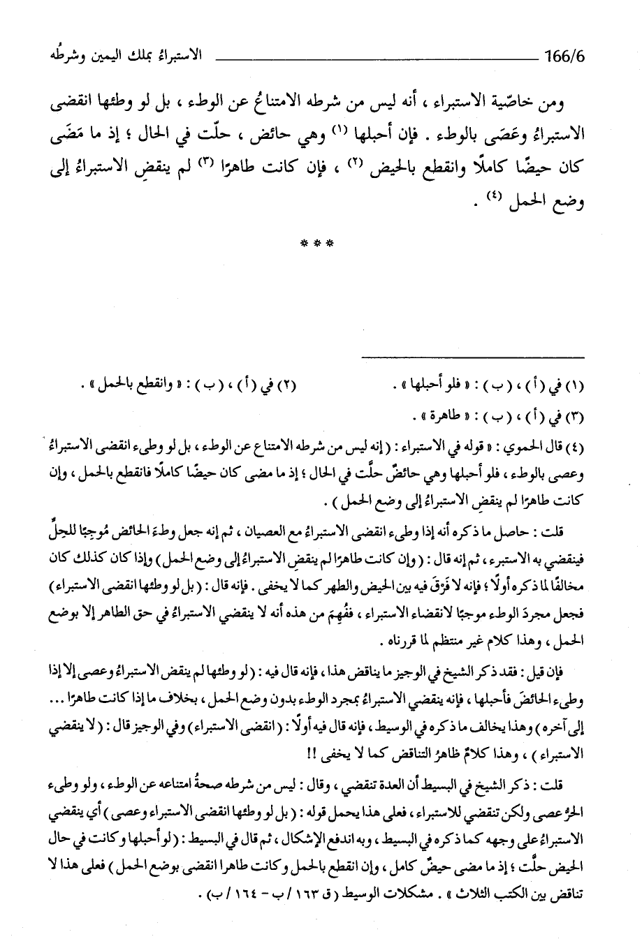 وَمن خاصية الإستبراء أَنه لَيْسَ من شَرطه الإمتناع عَن الْوَطْء بل لَو وَطئهَا انْقَضى الإستبراء وَعصى بِالْوَطْءِ فَإِن أحبلها وَهِي حَائِض حلت فِي الْحَال إِذْ مَا مضى كَانَ حيضا كَامِلا وَانْقطع بِالْحيضِ فَإِن كَانَت طَاهِرا لم ينْقض الإستبراء إِلَى وضع الْحمل