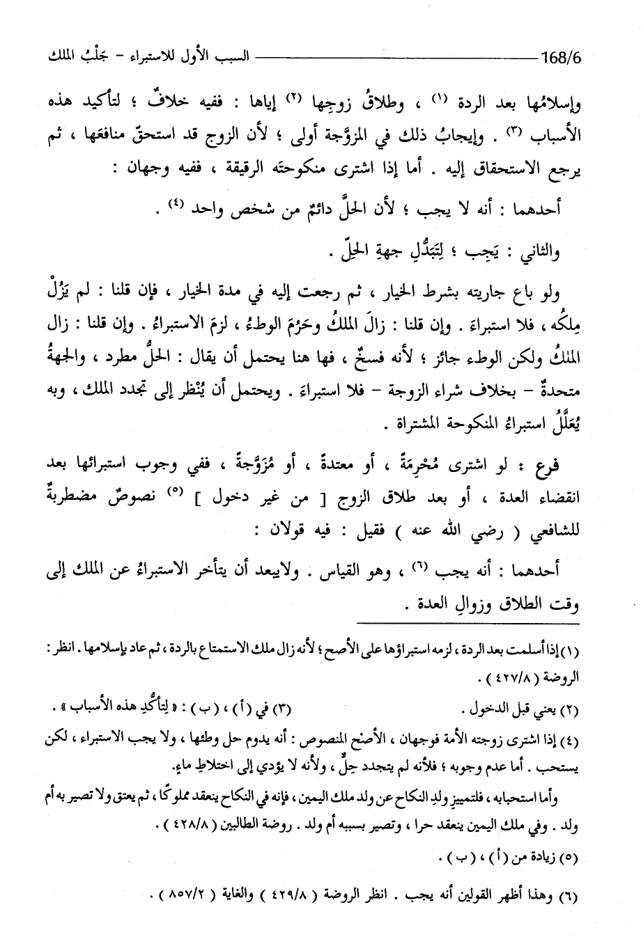 وإسلامها بعد الرِّدَّة وَطَلَاق زَوجهَا إِيَّاهَا فَفِيهِ خلاف لتأكيد هَذِه الْأَسْبَاب وَإِيجَاب ذَلِك فِي المزدوجة اولى لِأَن الزَّوْج قد اسْتحق مَنَافِعهَا ثمَّ يرجع الإستحقاق إِلَيْهِ أما إِذا اشْترى منكوحته الرقيقة فَفِيهِ وَجْهَان