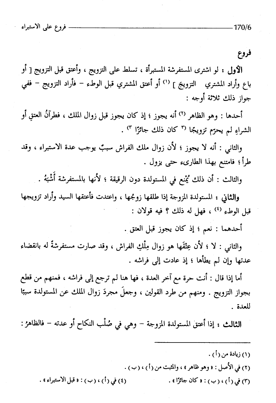 الأول لَو اشْترى المستفرشة المستبرأة تسلط على التَّزْوِيج وَأعْتق قبل التَّزْوِيج أَو بَاعَ وَأَرَادَ المُشْتَرِي التَّزْوِيج أَو أعتق المُشْتَرِي قبل الْوَطْء فَأَرَادَ التَّزْوِيج فَفِي جَوَاز ذَلِك ثَلَاثَة أوجه