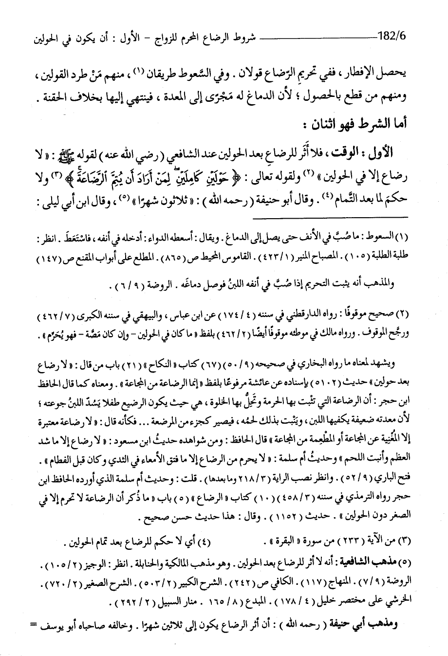 الأول الْوَقْت فَلَا أثر للرضاع بعد الْحَوْلَيْنِ عِنْد الشَّافِعِي رَضِي الله عَنهُ لقَوْله صلى الله عَلَيْهِ وَسلم لَا رضَاع إِلَّا فِي الْحَوْلَيْنِ وَلقَوْله تَعَالَى {حَوْلَيْنِ كَامِلين لمن أَرَادَ أَن يتم الرضَاعَة} وَلَا حكم لما بعد التَّمام وَقَالَ أَبُو حنيفَة رَحمَه الله ثَلَاثُونَ شهرا وَقَالَ ابْن أبي ليلى