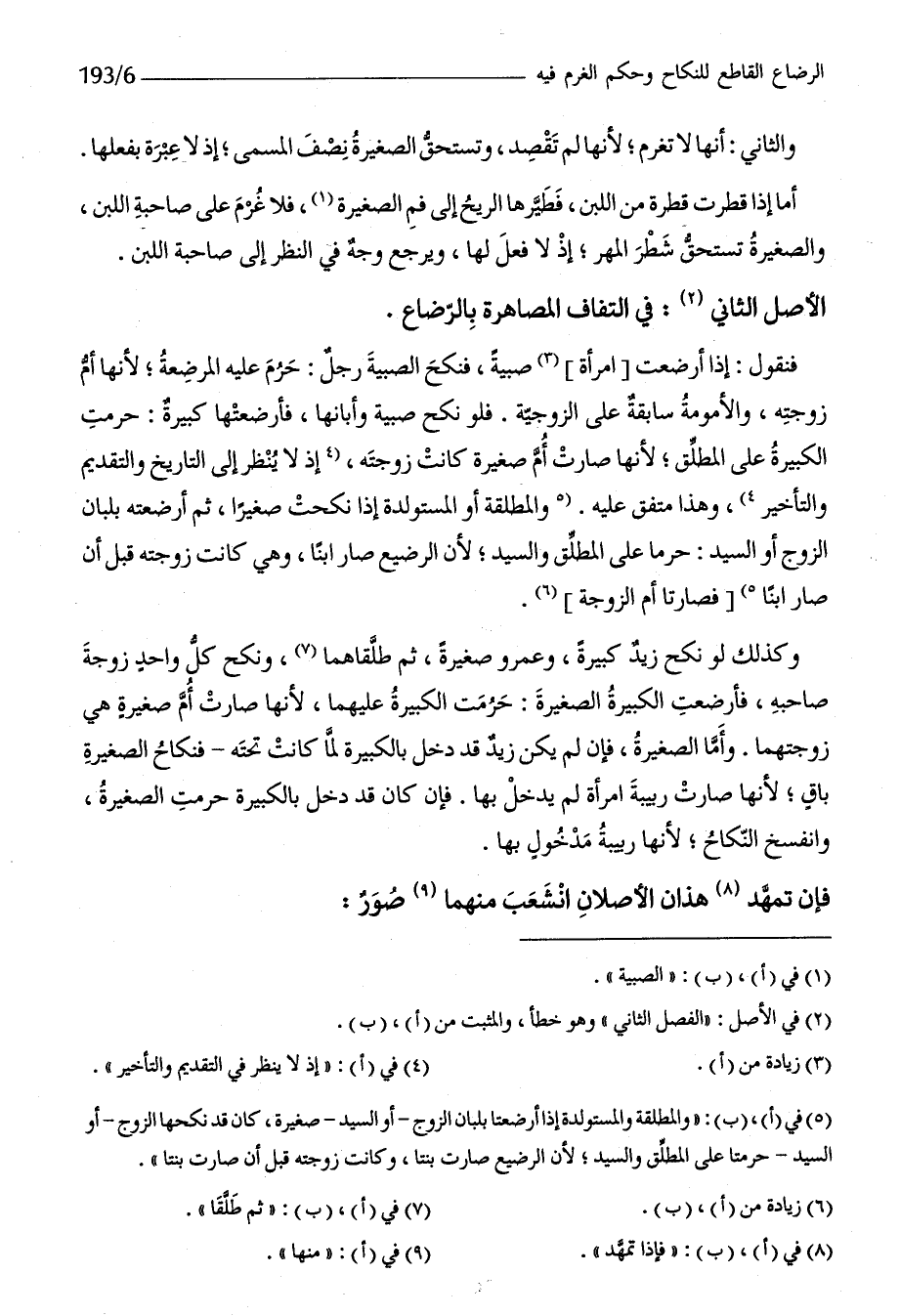 فَنَقُول إِذا أرضعت امْرَأَة صبية فنكح الصبية رجل حرم عَلَيْهِ الْمُرضعَة لِأَنَّهَا أم زَوجته والأمومة سَابِقَة على الزَّوْجِيَّة فَلَو نكح صبية وأبانها فأرضعتها كَبِيرَة حرمت الْكَبِيرَة على الْمُطلق لِأَنَّهَا صَارَت أم صَغِيرَة كَانَت زَوجته إِذْ لَا ينظر إِلَى التَّارِيخ والتقديم وَالتَّأْخِير وَهَذَا مُتَّفق عَلَيْهِ والمطلقة أَو الْمُسْتَوْلدَة إِذا نكحت صَغِيرا ثمَّ أَرْضَعَتْه بلبان الزَّوْج أَو السَّيِّد حرما على الْمُطلق وَالسَّيِّد لِأَن الرَّضِيع صَار ابْنا وَهِي كَانَت زَوجته قبل أَن صَار ابْنا فصارتا أم الزَّوْجَة