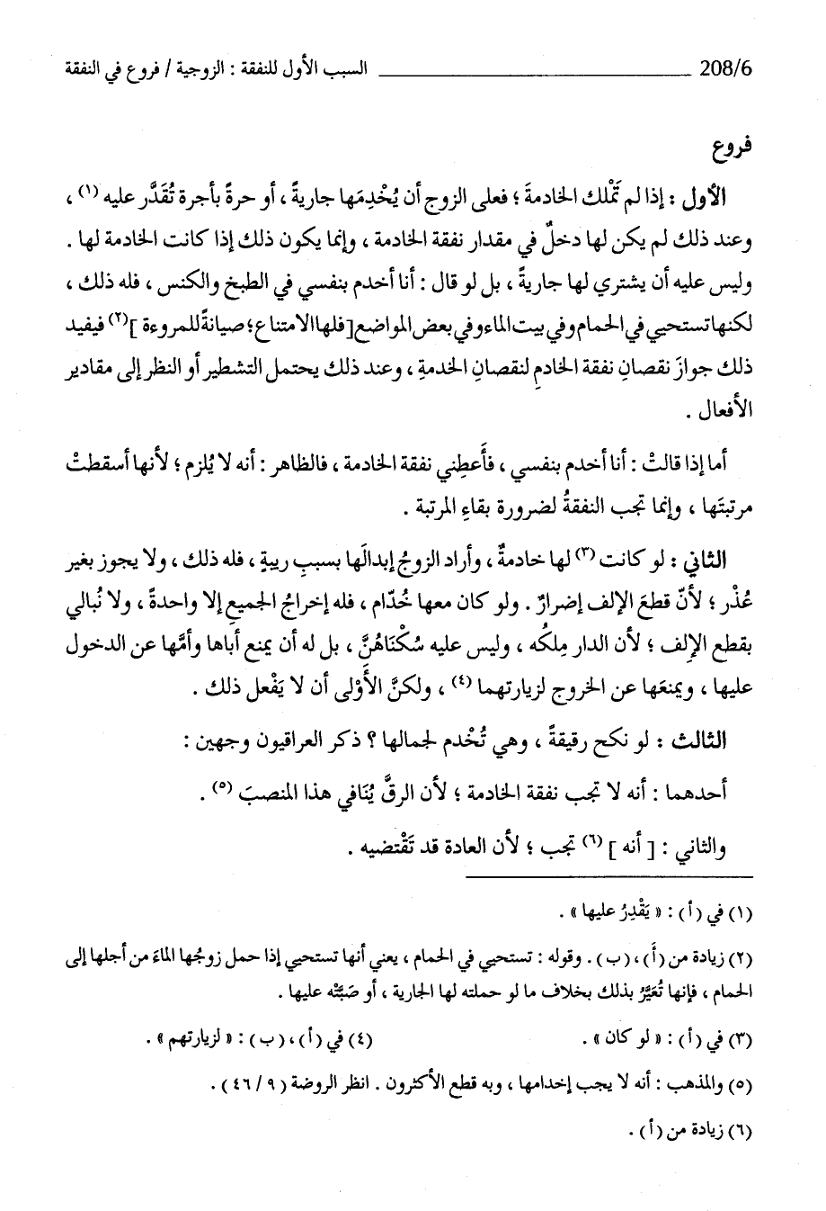 الأول إِذا لم تملك الخادمة فعلى الزَّوْج أَن يخدمها جَارِيَة أَو حرَّة بِأُجْرَة تقدر عَلَيْهِ وَعند ذَلِك لم يكن لَهَا دخل فِي مِقْدَار نَفَقَة الخادمة وَإِنَّمَا يكون ذَلِك إِذا كَانَت الخادمة لَهَا وَلَيْسَ عَلَيْهِ أَن يَشْتَرِي لَهَا جَارِيَة بل لَو قَالَ أَنا اخدم بنفسي فِي الطَّبْخ والكنس فَلهُ ذَلِك لَكِنَّهَا تستحيي فِي الْحمام وَفِي بَيت المَاء وَفِي بعض الْمَوَاضِع فلهَا الإمتناع صِيَانة للمروءة فَيُفِيد ذَلِك جَوَاز نُقْصَان نَفَقَة الْخَادِم لنُقْصَان الْخدمَة وَعند ذَلِك يحْتَمل التشطير أَو النّظر إِلَى مقادير الْأَفْعَال