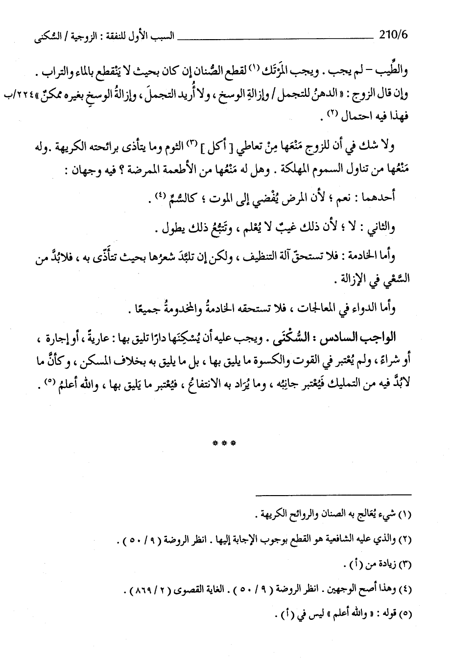 الْوَاجِب السَّادِس السُّكْنَى وَيجب عَلَيْهِ أَن يسكنهَا دَارا تلِيق بهَا عَارِية أَو إِجَارَة أَو شِرَاء وَلم يعْتَبر فِي الْقُوت وَالْكِسْوَة مَا يَلِيق بهَا بل مَا يَلِيق بِهِ بِخِلَاف الْمسكن وَكَأن مَا لَا بُد فِيهِ من التَّمْلِيك فَيعْتَبر جَانِبه وَمَا يُرَاد بِهِ الإنتفاع فَيعْتَبر مَا يَلِيق بهَا وَالله أعلم