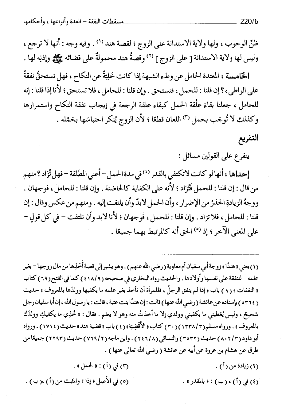 الْخَامِسَة الْمُعْتَدَّة الْحَامِل عَن وَطْء الشُّبْهَة إِذا كَانَت خلية عَن النِّكَاح فَهَل تسْتَحقّ نَفَقَة على الواطىء إِن قُلْنَا للْحَمْل فتستحق وَإِن قُلْنَا للحامل فَلَا تسْتَحقّ لأَنا إِذا قُلْنَا إِنَّه للحامل جعلنَا بَقَاء علقَة الْحمل كبقاء علقَة الرّجْعَة فِي إِيجَاب نَفَقَة النِّكَاح واستمرارها وَكَذَلِكَ لَا توجب بِحمْل اللّعان قطعا لِأَن الزَّوْج يُنكر احتباسها بِحمْلِهِ