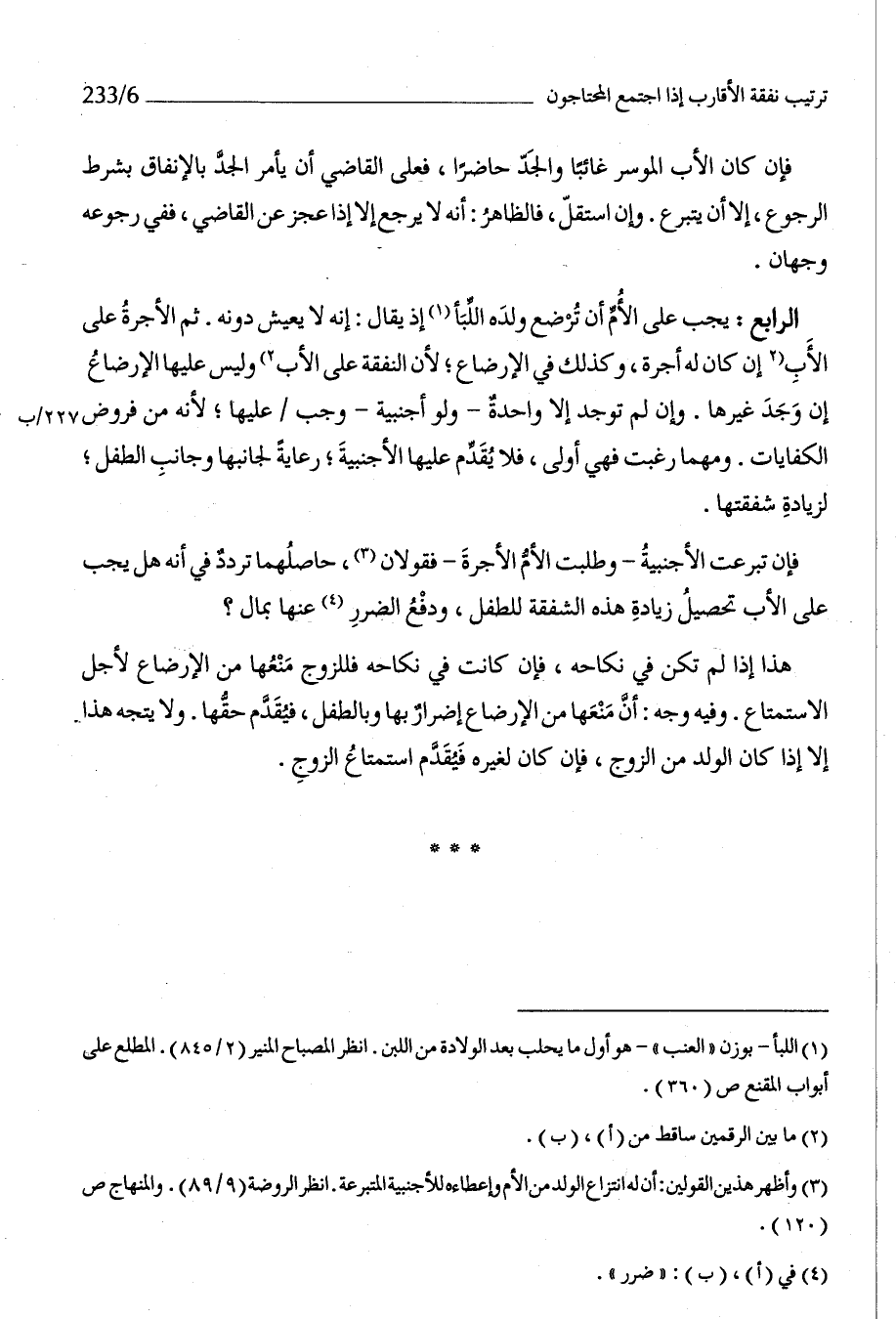 الرَّابِع يجب على الام أَن ترْضع وَلَده اللبأ إِذْ يُقَال إِنَّه لَا يعِيش دونه ثمَّ الْأُجْرَة على الْأَب إِن كَانَ لَهُ أُجْرَة وَكَذَلِكَ فِي الْإِرْضَاع لِأَن النَّفَقَة على الْأَب وَلَيْسَ عَلَيْهَا الْإِرْضَاع إِن وجد غَيرهَا وَإِن لم تُوجد إِلَّا وَاحِدَة وَلَو أَجْنَبِيَّة وَجب عَلَيْهَا لِأَنَّهُ من فروض الكفايات وَمهما رغبت فَهِيَ أولى فَلَا يقدم عَلَيْهَا الْأَجْنَبِيَّة رِعَايَة لجانبها وجانب الطِّفْل لزِيَادَة شفقتها