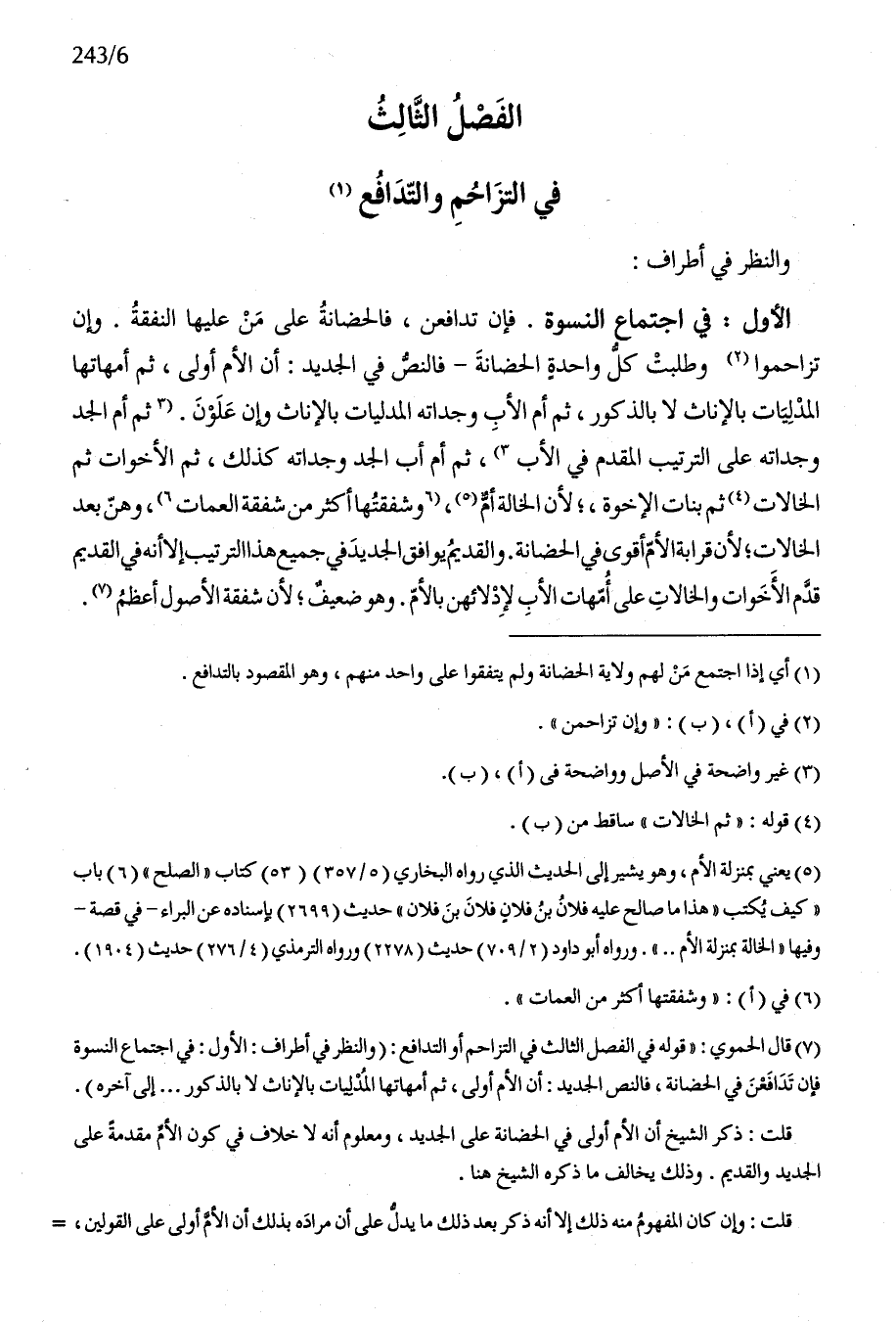 الأول فِي اجْتِمَاع النسْوَة فَإِن تدافعن فالحاضنة على من عَلَيْهَا النَّفَقَة وَإِن تزاحموا وَطلبت كل وَاحِدَة الْحَضَانَة فالنص فِي الْجَدِيد أَن الْأُم أولى ثمَّ أمهاتها المدليات بالإناث لَا بالذكور ثمَّ أم الْأَب وجداته المدليات بالإناث وَإِن علون ثمَّ أم الْجد وجداته على التَّرْتِيب الْمُقدم فِي الْأَب ثمَّ أم أَب الْجد وجداته كَذَلِك ثمَّ الْأَخَوَات ثمَّ الخالات ثمَّ بَنَات الْإِخْوَة لِأَن الْخَالَة أم وشفقتها أَكثر من شَفَقَة العمات وَهن بعد الخالات لِأَن قرَابَة الْأُم أقوى فِي الْحَضَانَة وَالْقَدِيم يُوَافق الْجَدِيد فِي جَمِيع هَذَا التَّرْتِيب إِلَّا أَنه فِي الْقَدِيم قدم الْأَخَوَات والخالات على أُمَّهَات الْأَب لإدلائهن بِالْأُمِّ وَهُوَ ضَعِيف لِأَن شَفَقَة الْأُصُول أعظم