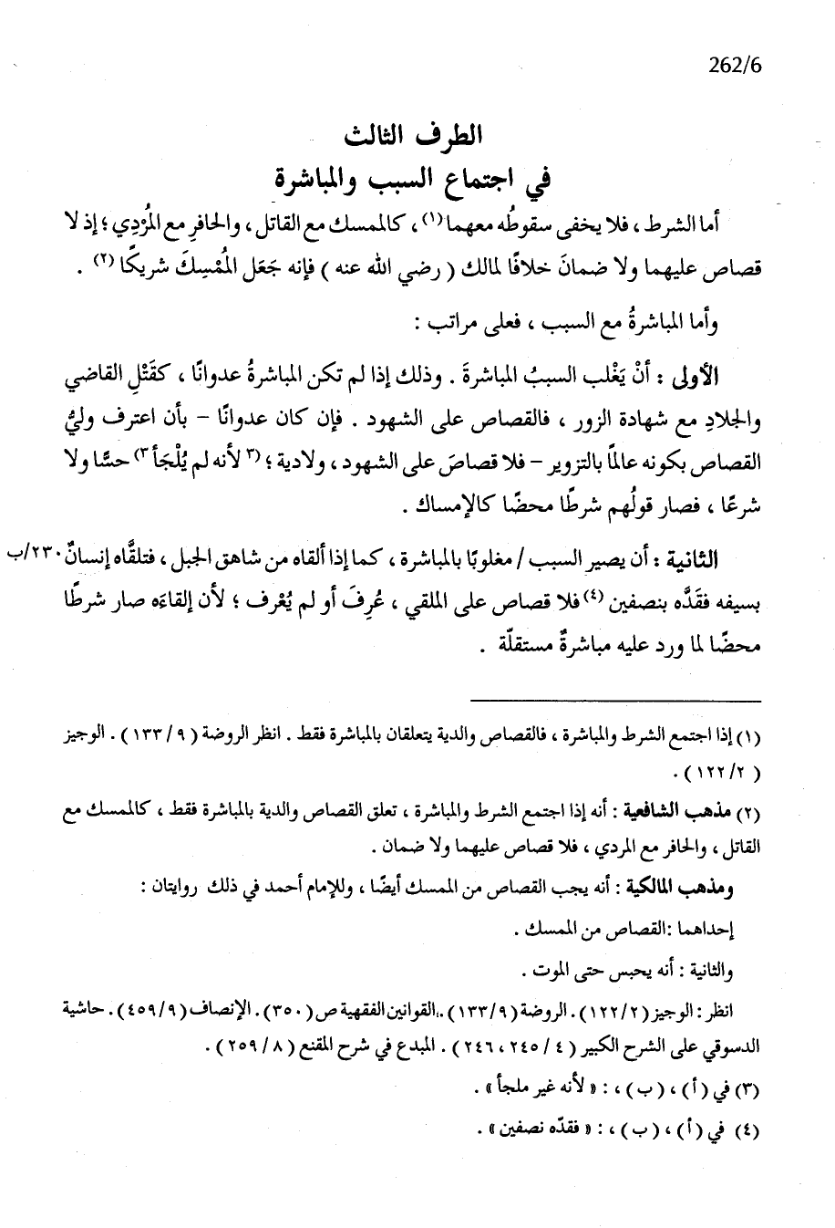 الأولى أَن يغلب السَّبَب الْمُبَاشرَة وَذَلِكَ إِذا لم تكن الْمُبَاشرَة عُدْوانًا كَقَتل القَاضِي والجلاد مَعَ شَهَادَة الزُّور فالقصاص على الشُّهُود فَإِن كَانَ عُدْوانًا بِأَن اعْترف ولي الْقصاص بِكَوْنِهِ عَالما بالتزوير فَلَا قصاص على الشُّهُود وَلَا دِيَة لِأَنَّهُ لم يلجأ حسا وَلَا شرعا فَصَارَ قَوْلهم شرطا مَحْضا كالإمساك