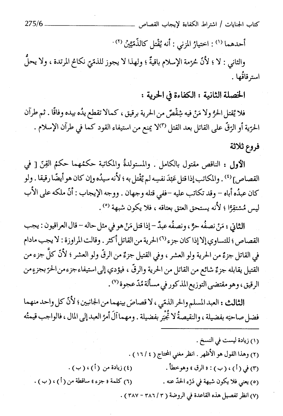 الثَّانِي من نصف حر وَنصفه عبد إِذا قتل من هُوَ فِي مثل حَاله قَالَ الْعِرَاقِيُّونَ يجب الْقصاص للتساوي إِلَّا إِذا كَانَ جُزْء الْحُرِّيَّة من الْقَاتِل أَكثر وَقَالَت المراوزة لَا يجب مَا دَامَ فِي الْقَاتِل جُزْء من الْحُرِّيَّة وَلَو الْعشْر وَفِي الْقَتِيل جُزْء من الرّقّ وَلَو الْعشْر لِأَن كل جُزْء من الْقَتِيل يُقَابله جُزْء شَائِع من الْقَاتِل من الْحُرِّيَّة وَالرّق فَيُؤَدِّي إِلَى اسْتِيفَاء جُزْء من الْحر بِجُزْء من الرَّقِيق وَهُوَ مقتضي التَّوْزِيع الْمَذْكُور فِي مَسْأَلَة مد عَجْوَة