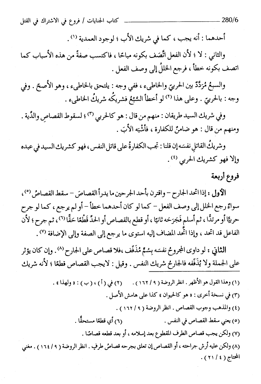 الأول إِذا اتَّحد الْجَارِح واقترن بِأحد الجرحين مَا يدْرَأ الْقصاص سقط الْقصاص سَوَاء رَجَعَ الْخلَل إِلَى وصف الْفِعْل كَمَا لَو كَانَ أَحدهمَا خطأ أَو لم يرجع كَمَا لَو جرح حَرْبِيّا أَو مُرْتَدا ثمَّ أسلم فجرحه ثَانِيًا أَو قطع بِالْقصاصِ أَو الْحَد قطعا حَقًا ثمَّ جرح لِأَن الْفَاعِل قد اتَّحد وَإِذا اتَّحد الْمُضَاف إِلَيْهِ اسْتَوَى مَا يرجع إِلَى الصّفة وَإِلَى الْإِضَافَة