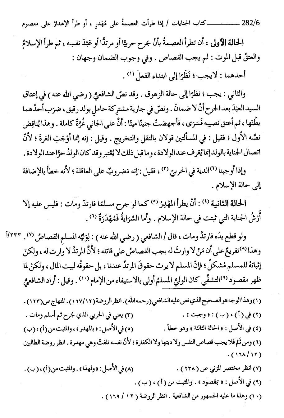الْحَالة الأولى أَن تطرأ الْعِصْمَة بِأَن جرح حَرْبِيّا أَو مُرْتَدا أَو عبد نَفسه ثمَّ طَرَأَ الْإِسْلَام وَالْعِتْق قبل الْمَوْت لم يجب الْقصاص وَفِي وجوب الضَّمَان وَجْهَان
