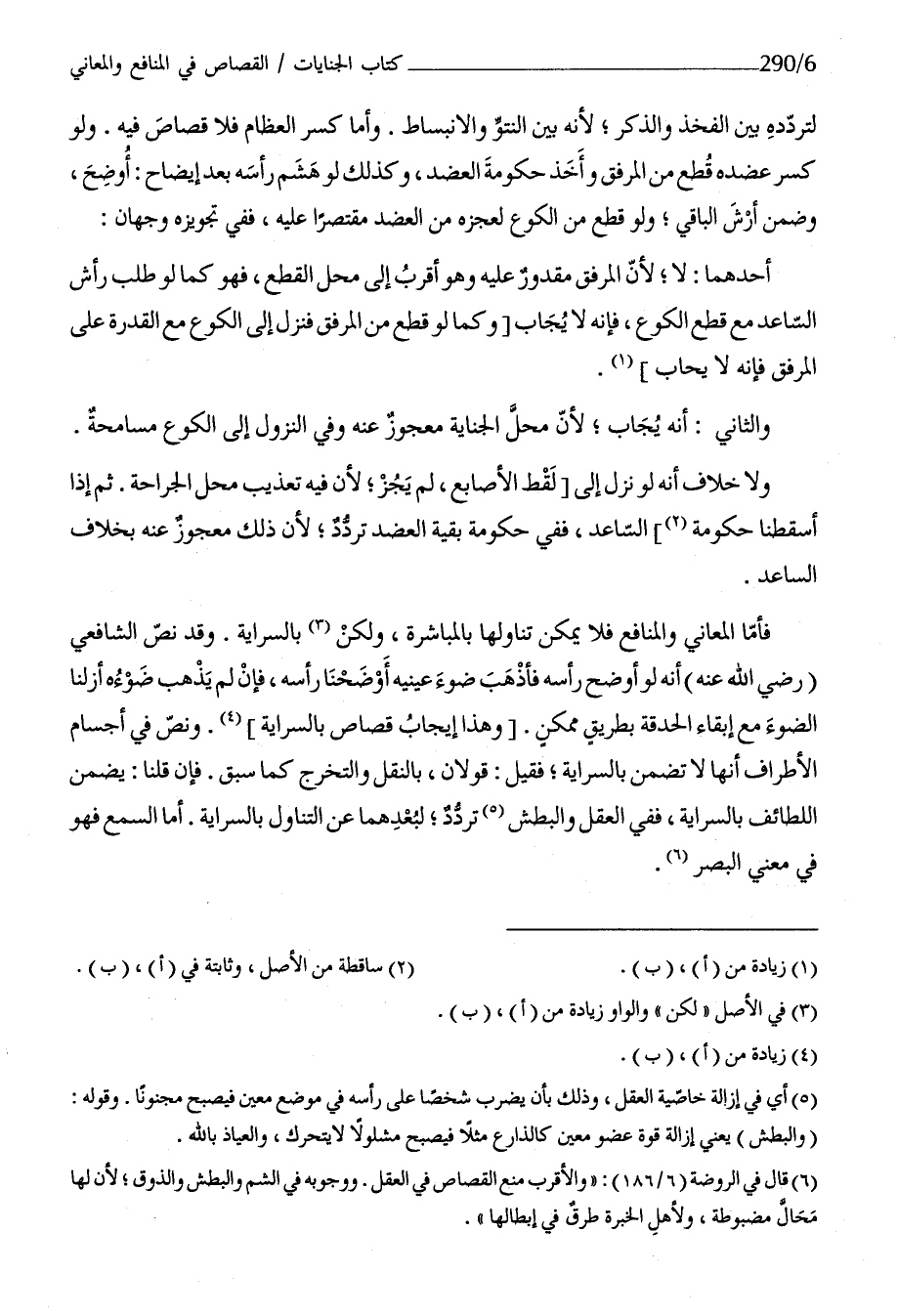 فَأَما الْمعَانِي وَالْمَنَافِع فَلَا يُمكن تنَاولهَا بِالْمُبَاشرَةِ وَلَكِن بِالسّرَايَةِ وَقد نَص الشَّافِعِي رَضِي الله عَنهُ أَنه لَو أوضح رَأسه فَأذْهب ضوء عَيْنَيْهِ أوضحنا رَأسه فَإِن لم يذهب ضوءه أزلنا الضَّوْء مَعَ إبْقَاء الحدقة بطرِيق مُمكن وَهَذَا إِيجَاب قصاص بِالسّرَايَةِ وَنَصّ فِي أجسام الْأَطْرَاف أَنَّهَا لَا تضمن بِالسّرَايَةِ فَقيل قَولَانِ بِالنَّقْلِ والتخرج كَمَا سبق فَإِن قُلْنَا يضمن اللطائف بِالسّرَايَةِ فَفِي الْعقل والبطش تردد لبعدهما عَن التَّنَاوُل بِالسّرَايَةِ أما السّمع فَهُوَ فِي 2 معنى الْبَصَر