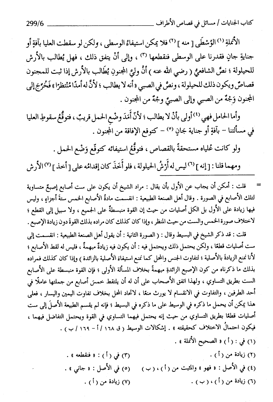 الْأُنْمُلَة الْوُسْطَى مِنْهُ فَلَا يُمكن اسْتِيفَاء الْوُسْطَى وَلَكِن لَو سَقَطت الْعليا بِآفَة أَو جِنَايَة جَان فقدرنا على الْوُسْطَى فنقطعها وَإِلَى أَن يتَّفق ذَلِك فَهَل يُطَالب بِالْأَرْشِ للْحَيْلُولَة نَص الشَّافِعِي رَضِي الله عَنهُ أَن ولي الْمَجْنُون يُطَالب بِالْأَرْشِ إِذا ثَبت للمجنون قصاص وَيكون ذَلِك للْحَيْلُولَة وَنَصّ فِي الصَّبِي أَنه لَا يُطَالب لِأَن لَهُ أمدا منتظرا فَخرج إِلَى الْمَجْنُون وَجه من الصَّبِي وَإِلَى الصَّبِي وَجه من الْمَجْنُون