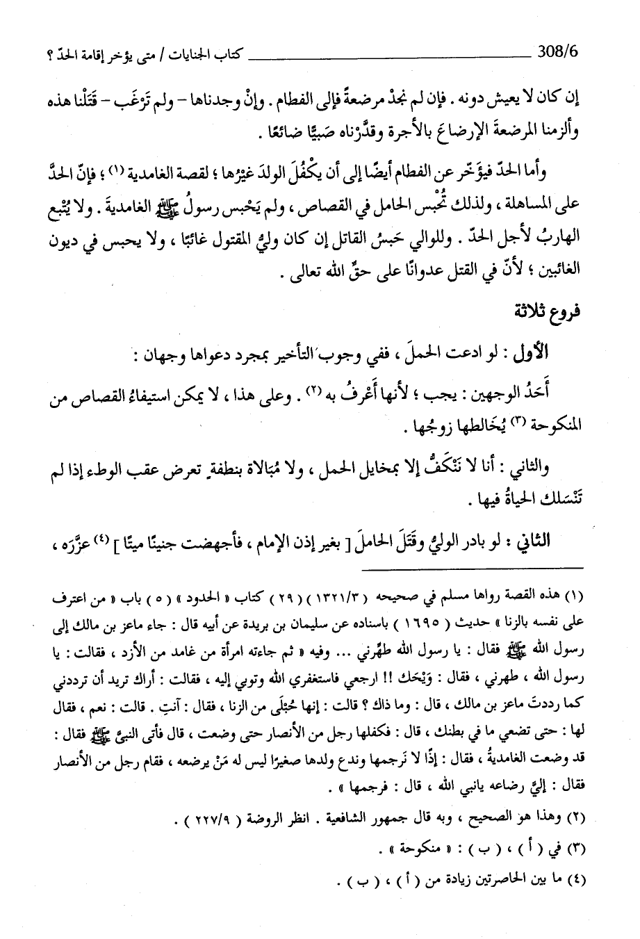 وَأما الْحَد فيؤخر عَن الْفِطَام أَيْضا إِلَى أَن يكفل الْوَلَد غَيرهَا لقصة الغامدية فَإِن الْحَد على المساهلة وَلذَلِك تحبس الْحَامِل فِي الْقصاص وَلم يحبس رَسُول الله صلى الله عَلَيْهِ وَسلم الغامدية وَلَا يتبع الهارب لاجل الْحَد وللوالي حبس الْقَاتِل إِن كَانَ ولي الْمَقْتُول غَائِبا وَلَا يحبس فِي دُيُون الغائبين لِأَن فِي الْقَتْل عُدْوانًا على حق الله تَعَالَى
