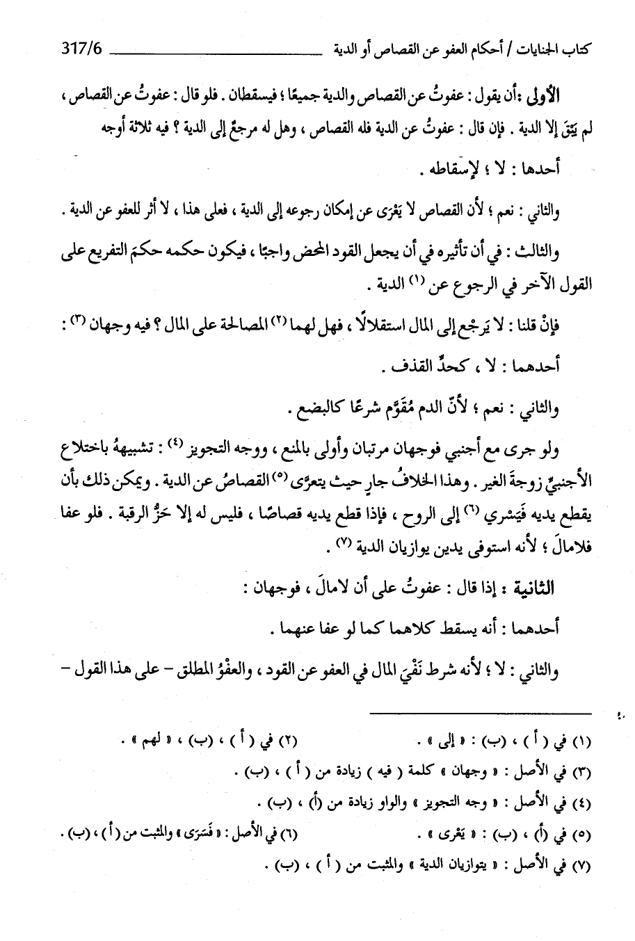 الأولى أَن يَقُول عَفَوْت عَن الْقصاص وَالدية جَمِيعًا فيسقطان فَلَو قَالَ عَفَوْت عَن الْقصاص لم يبْق إِلَّا الدِّيَة فَإِن قَالَ عَفَوْت عَن الدِّيَة فَلهُ الْقصاص وَهل لَهُ مرجع إِلَى الدِّيَة فِيهِ ثَلَاثَة أوجه