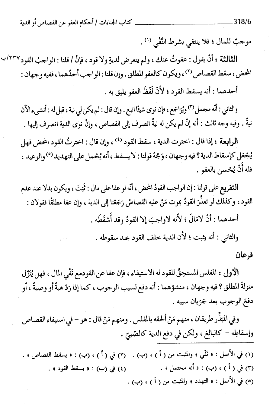 الأول الْمُفلس الْمُسْتَحق للقود لَهُ الإستيفاء فَإِن عَفا عَن الْقود مَعَ نفي المَال فَهَل ينزل منزلَة الْمُطلق فِيهِ وَجْهَان منشؤهما أَنه دفع لسَبَب الْوُجُوب كَمَا إِذا رد هبة أَو وَصِيَّة أَو دفع الْوُجُوب بعد جَرَيَان سَببه