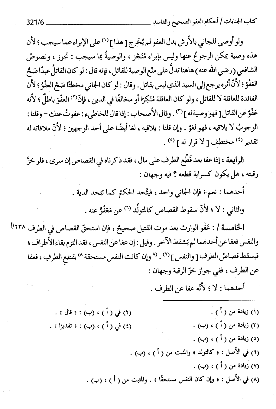 الْخَامِسَة عَفْو الْوَارِث بعد موت الْقَتِيل صَحِيح فَإِن اسْتحق الْقصاص فِي الطّرف وَالنَّفس فَعَفَا عَن أَحدهمَا لم يسْقط الآخر وَقيل إِن عَفا عَن النَّفس فقد الْتزم بَقَاء الْأَطْرَاف فَيسْقط قصاص الطّرف وَالنَّفس وَإِن كَانَت النَّفس مُسْتَحقَّة بِقطع الطّرف فَعَفَا عَن الطّرف فَفِي جَوَاز حز الرَّقَبَة وَجْهَان