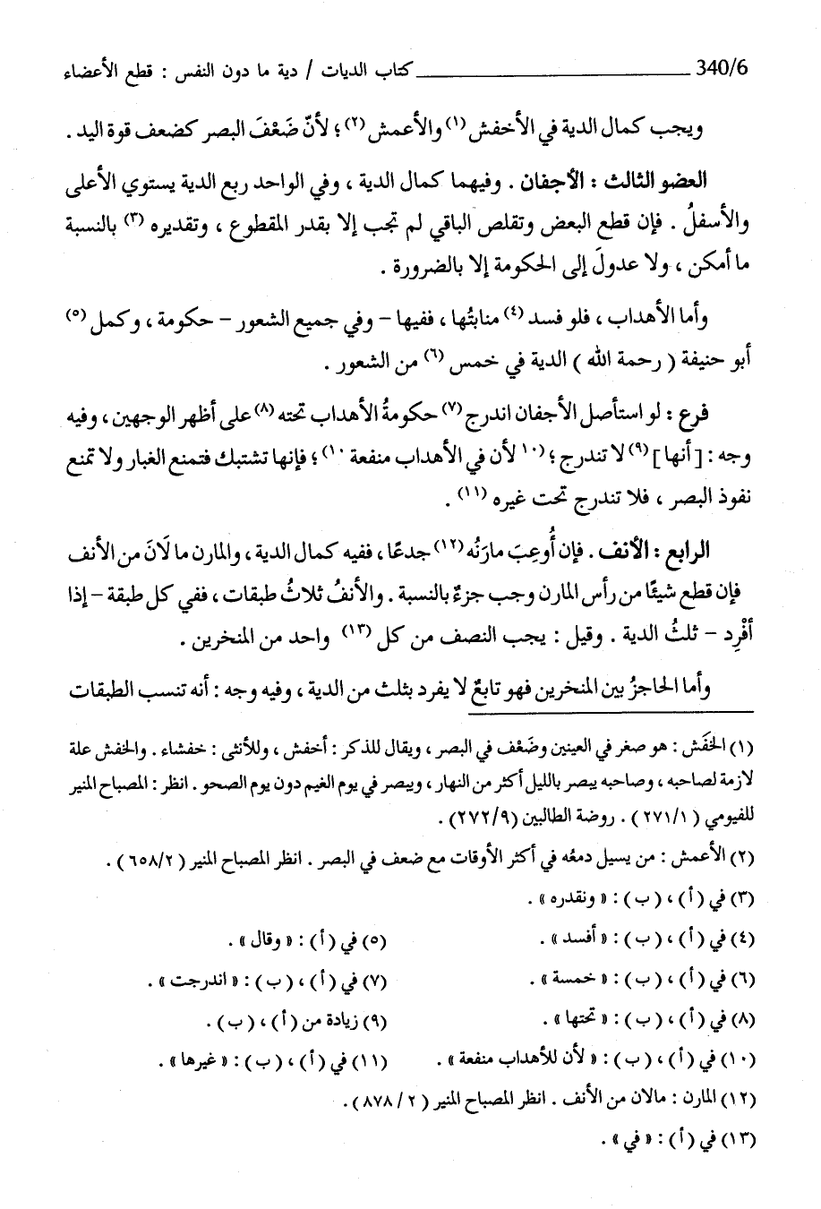 الرَّابِع الْأنف فَإِن أوعب مارنه جدعا فَفِيهِ كَمَال الدِّيَة والمارن مَا لَان من الْأنف فَإِن قطع شَيْئا من رَأس المارن وَجب جُزْء بِالنِّسْبَةِ وَالْأنف ثَلَاث طَبَقَات فَفِي كل طبقَة إِذا أفرد ثلث الدِّيَة وَقيل يجب النّصْف من كل وَاحِد من المنخرين