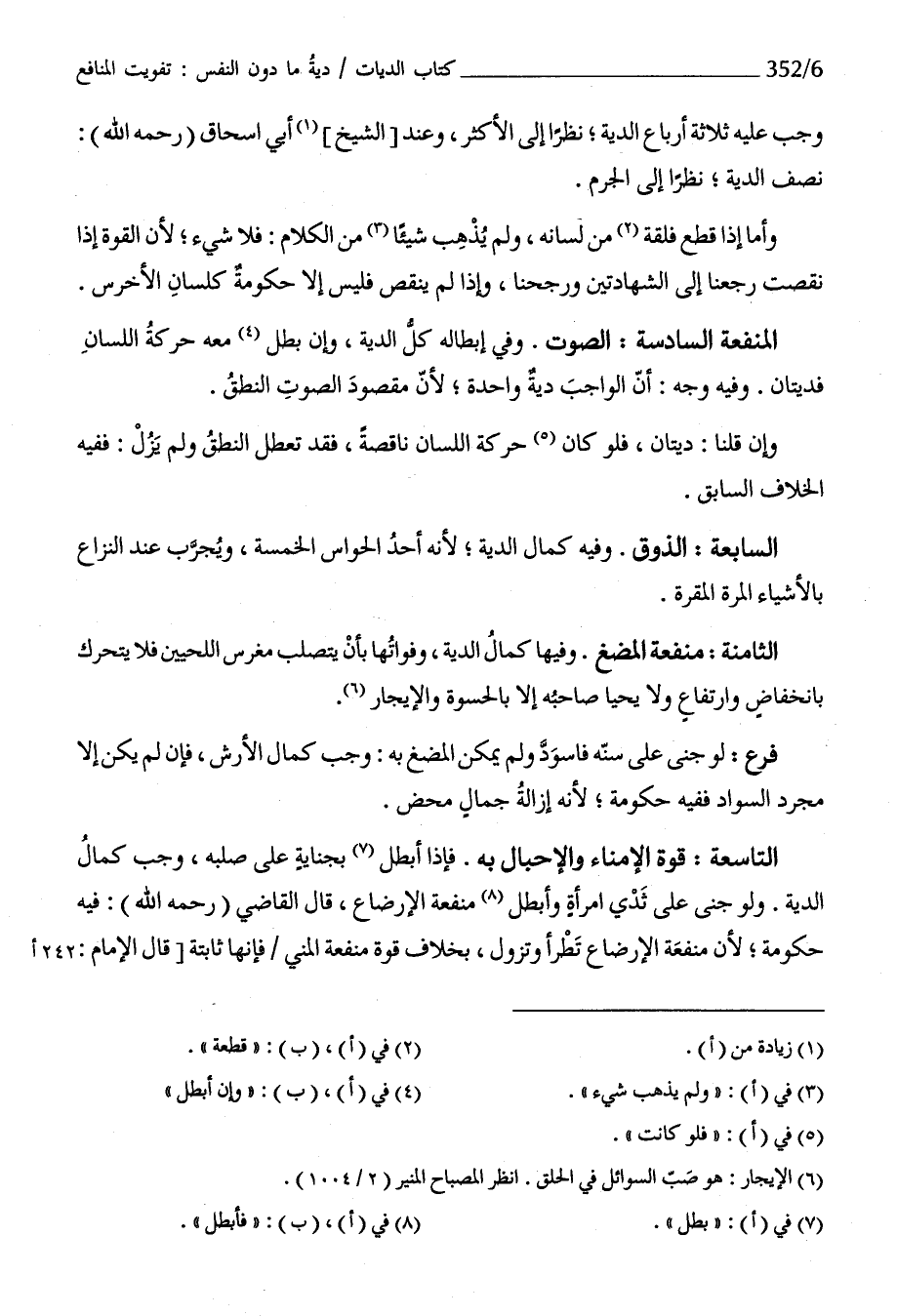 الْمَنْفَعَة السَّادِسَة الصَّوْت وَفِي إِبْطَاله كل الدِّيَة وَإِن بَطل مَعَه حَرَكَة اللِّسَان فديتان وَفِيه وَجه أَن الْوَاجِب دِيَة وَاحِدَة لِأَن مَقْصُود الصَّوْت النُّطْق