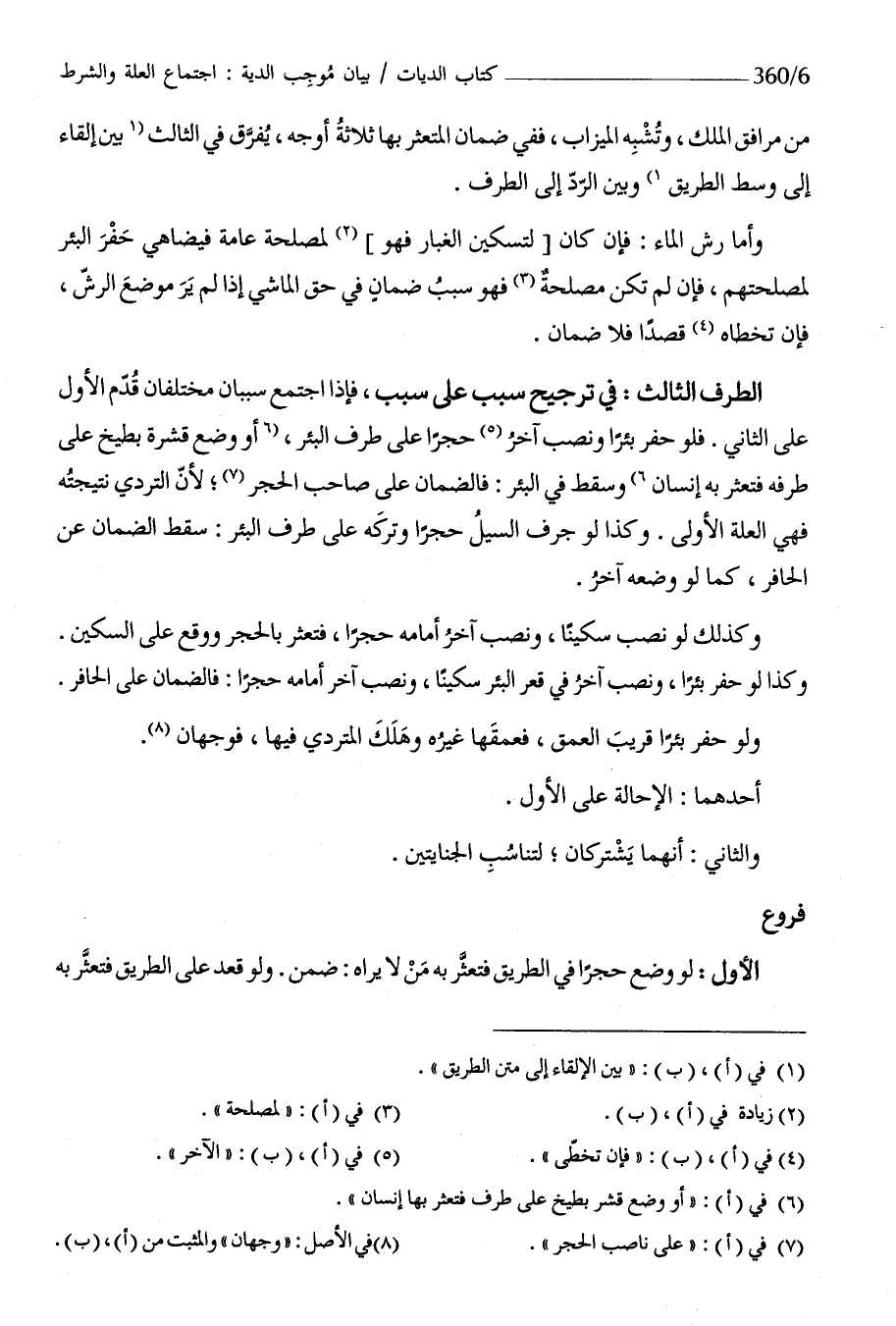 الطّرف الثَّالِث فِي تَرْجِيح سَبَب على سَبَب فَإِذا اجْتمع سببان مُخْتَلِفَانِ قدم الأول على الثَّانِي فَلَو حفر بِئْرا وَنصب آخر حجرا على طرف الْبِئْر أَو وضع قشرة بطيخ على طرفه فتعثر بِهِ إِنْسَان وَسقط فِي الْبِئْر فَالضَّمَان على صَاحب الْحجر لِأَن التردي نتيجته فَهِيَ الْعلَّة الأولى وَكَذَا لَو جرف السَّيْل حجرا وَتَركه على طرف الْبِئْر سقط الضَّمَان عَن الْحَافِر كَمَا لَو وَضعه آخر