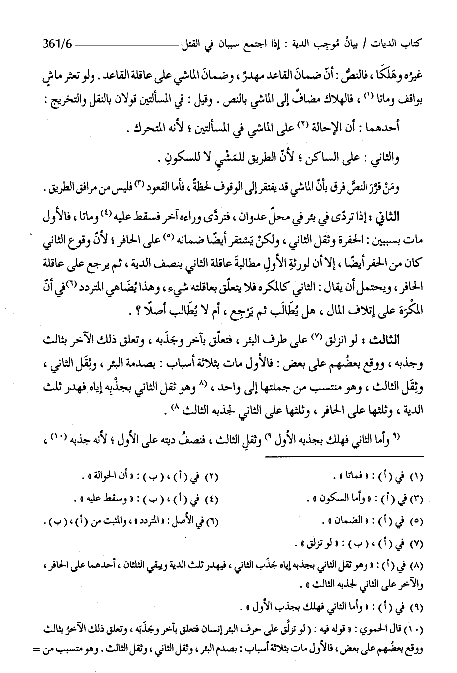 الثَّالِث لَو انزلق على طرف الْبِئْر فَتعلق بآخر وجذبه وَتعلق ذَلِك الآخر بثالث وجذبه وَوَقع بَعضهم على بعض فَالْأول مَاتَ بِثَلَاثَة أَسبَاب بصدمة الْبِئْر وَثقل الثَّانِي وَثقل الثَّالِث وَهُوَ منتسب من جُمْلَتهَا إِلَى وَاحِد وَهُوَ ثقل الثَّانِي بجذبه إِيَّاه فَهدر ثلث الدِّيَة وثلثها على الْحَافِر وثلثها على الثَّانِي لجذبه الثَّالِث