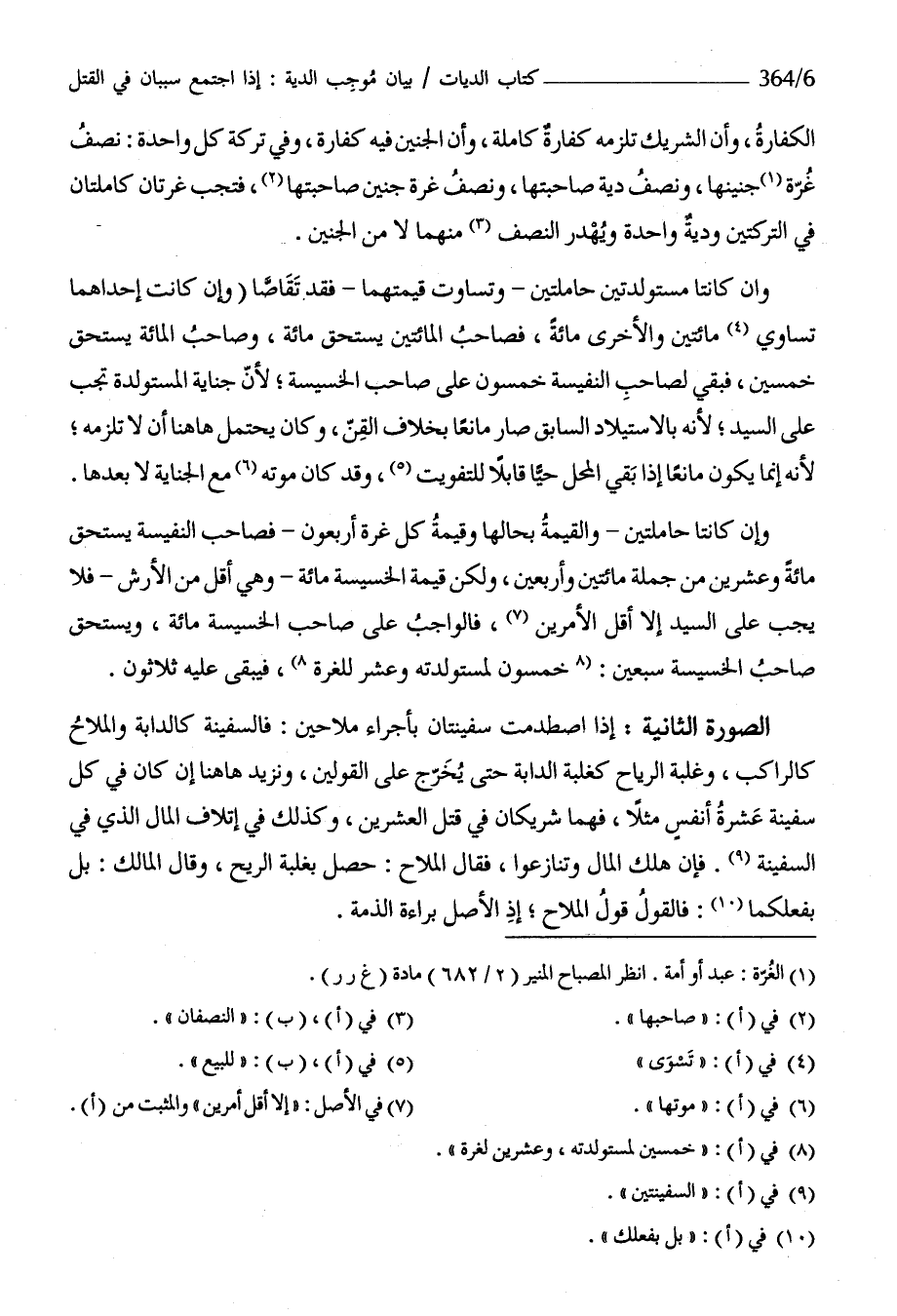 الصُّورَة الثَّانِيَة إِذا اصطدمت سفينتان بأجراء ملاحين فالسفينة كالدابة والملاح كالراكب وَغَلَبَة الرِّيَاح كغلبة الدَّابَّة حَتَّى يخرج على الْقَوْلَيْنِ ونزيد هَا هُنَا إِن كَانَ فِي كل سفينة عشرَة أنفس مثلا فهما شريكان فِي قتل الْعشْرين وَكَذَلِكَ فِي إِتْلَاف المَال الَّذِي فِي السَّفِينَة فَإِن هلك المَال وَتَنَازَعُوا فَقَالَ الملاح حصل بِغَلَبَة الرّيح وَقَالَ الْمَالِك بل بفعلكما فَالْقَوْل قَول الملاح إِذْ الأَصْل بَرَاءَة الذِّمَّة