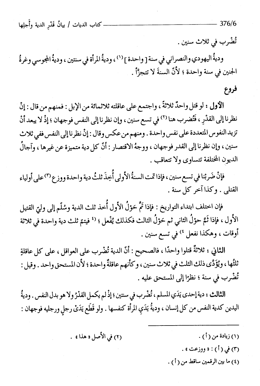 ودية الْيَهُودِيّ وَالنَّصْرَانِيّ فِي سنة وَاحِدَة ودية الْمَرْأَة فِي سنتَيْن ودية الْمَجُوسِيّ وغرة الْجَنِين فِي سنة وَاحِدَة لِأَن السّنة لَا تتجزأ