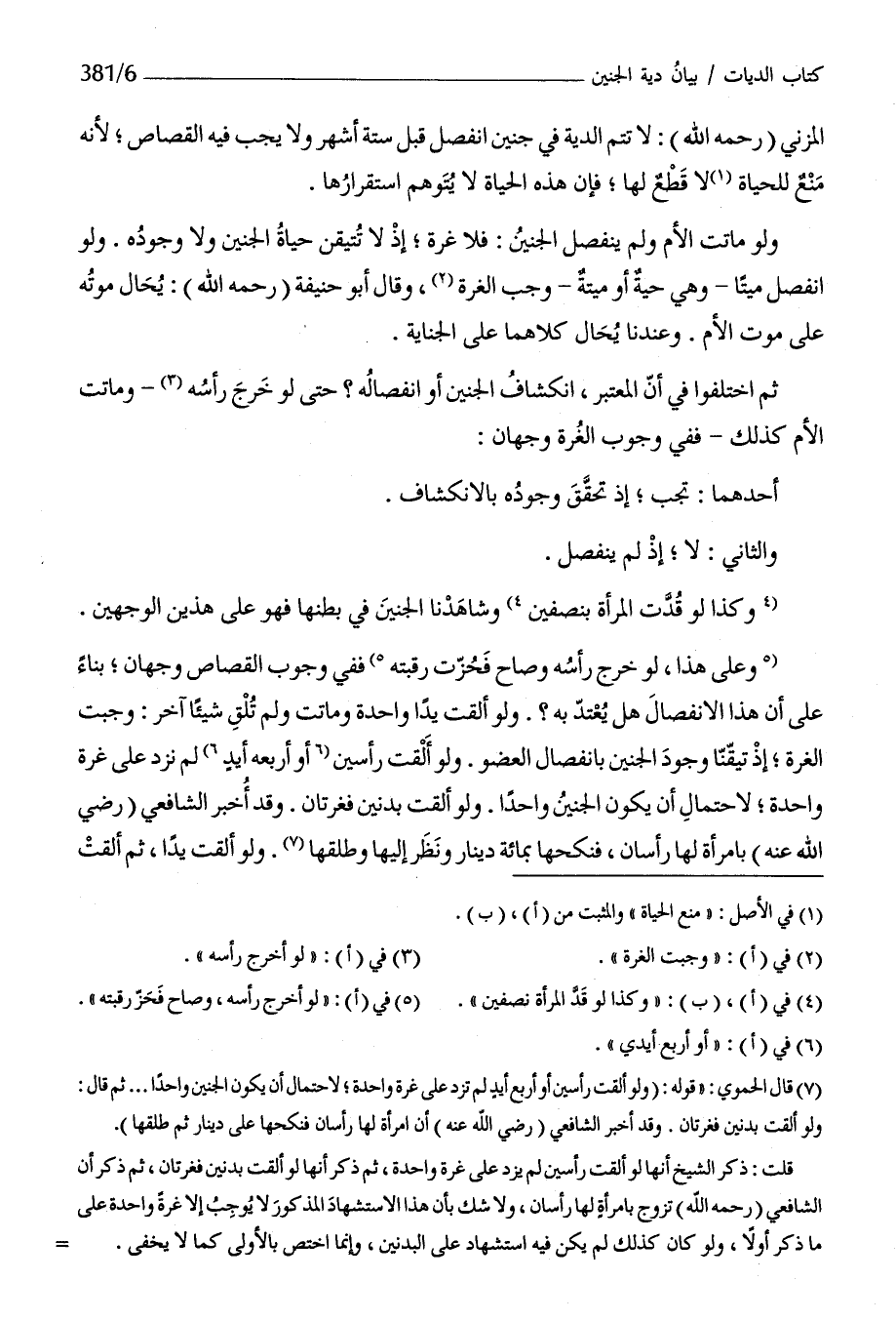 الْمُزنِيّ رَحمَه الله لَا تتمّ الدِّيَة فِي جَنِين انْفَصل قبل سِتَّة أشهر وَلَا يجب فِيهِ الْقصاص لِأَنَّهُ منع للحياة لَا قطع لَهَا فَإِن هَذِه الْحَيَاة لَا يتَوَهَّم استقرارها