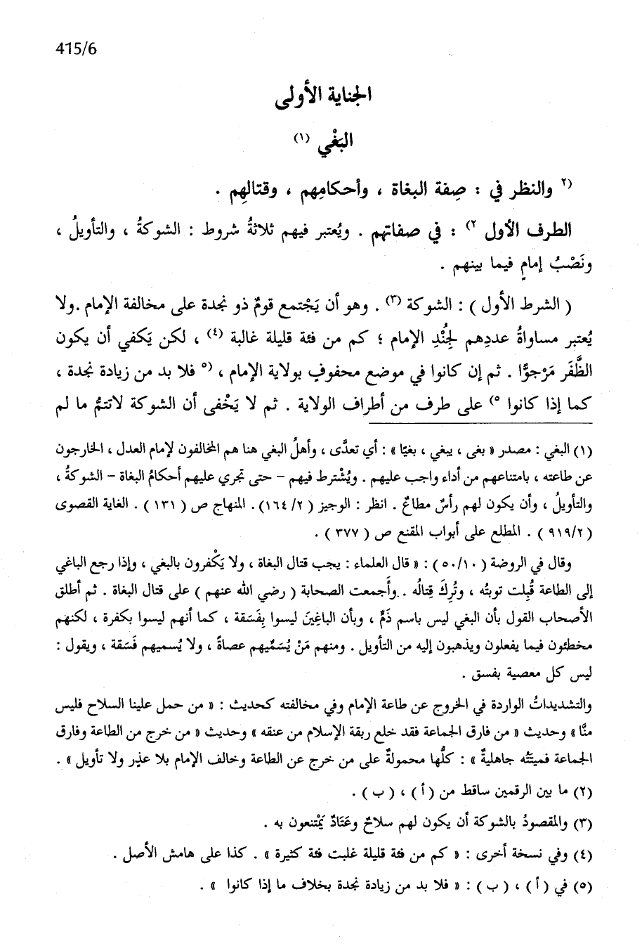الْجِنَايَة الأولى الْبَغي وَالنَّظَر فِي صفة الْبُغَاة وأحكامهم وقتالهم