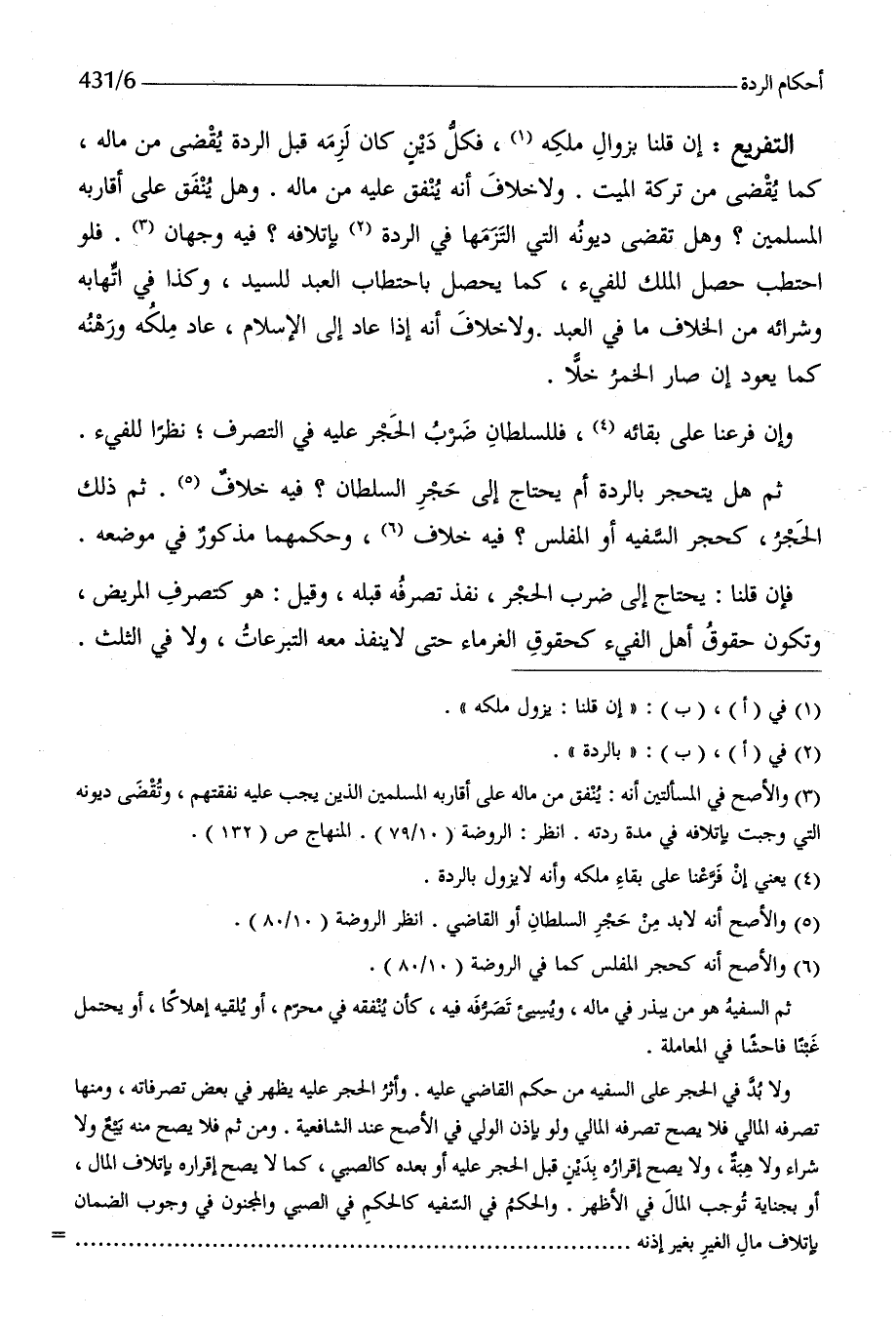 ثمَّ هَل يتحجر بِالرّدَّةِ أم يحْتَاج إِلَى حجر السُّلْطَان فِيهِ خلاف ثمَّ ذَلِك الْحجر كحجر السَّفِيه أَو الْمُفلس فِيهِ خلاف وحكمهما مَذْكُور فِي مَوْضِعه