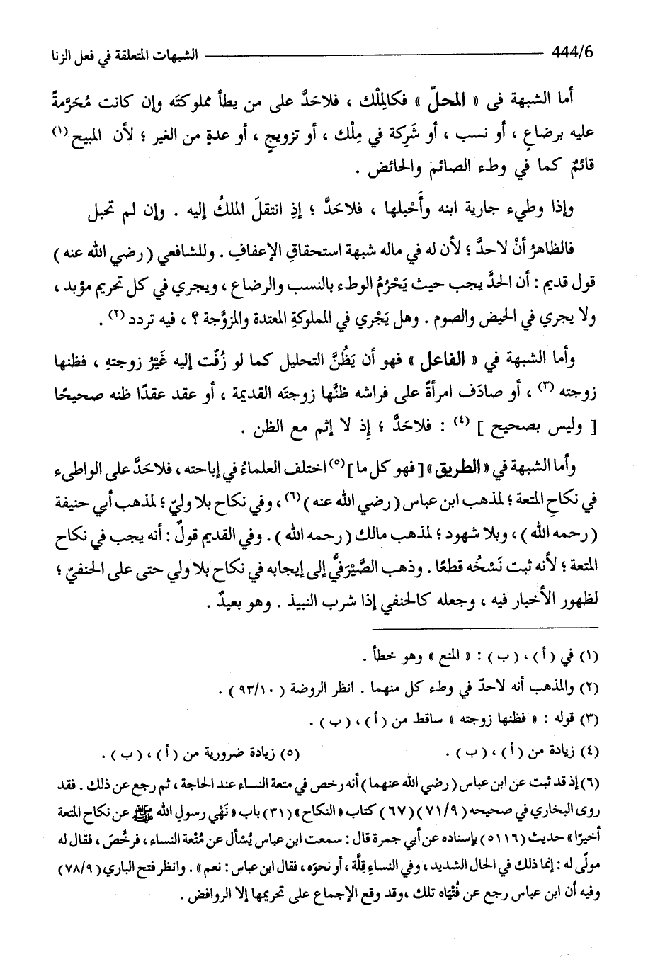 وَأما الشُّبْهَة فِي الطّرق فَهُوَ كل مَا اخْتلف الْعلمَاء فِي إِبَاحَته فَلَا حد على الواطىء فِي نِكَاح الْمُتْعَة لمَذْهَب ابْن عَبَّاس رَضِي الله عَنهُ وَفِي نِكَاح بِلَا ولي لمَذْهَب أبي حنيفَة رَحمَه الله وَبلا شُهُود لمَذْهَب مَالك رَحمَه الله وَفِي الْقَدِيم قَول أَنه يجب فِي نِكَاح الْمُتْعَة لِأَنَّهُ ثَبت نسخه قطعا وَذهب الصَّيْرَفِي إِلَى إِيجَابه فِي نِكَاح بِلَا ولي حَتَّى على الْحَنَفِيّ لظُهُور الْأَخْبَار فِيهِ وَجعله كالحنفي إِذا شرب النَّبِيذ وَهُوَ بعيد