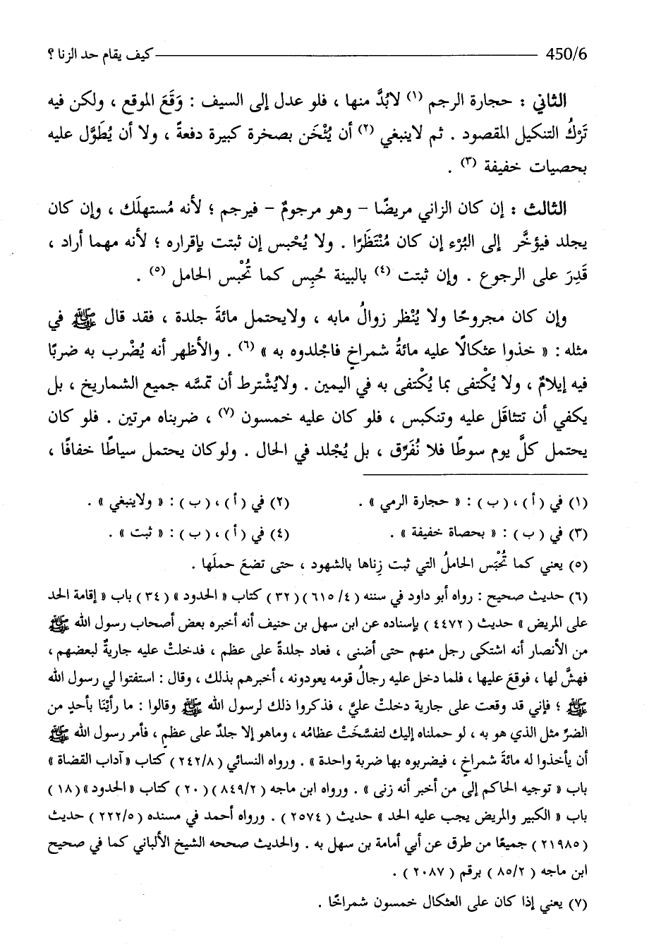 الثَّالِث إِن كَانَ الزَّانِي مَرِيضا وَهُوَ مرجوم فيرجم لِأَنَّهُ مستهلك وَإِن كَانَ يجلد فيؤخر إِلَى الْبُرْء إِن كَانَ منتظرا وَلَا يحبس إِن ثبتَتْ بِإِقْرَارِهِ لِأَنَّهُ مهما أَرَادَ قدر على الرُّجُوع وَإِن ثبتَتْ بِالْبَيِّنَةِ حبس كَمَا تحبس الْحَامِل