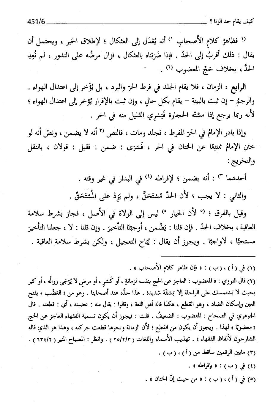 الرَّابِع الزَّمَان فَلَا يُقَام الْجلد فِي فرط الْحر وَالْبرد بل يُؤَخر إِلَى اعْتِدَال الْهَوَاء وَالرَّجم إِن ثَبت بِالْبَيِّنَةِ يُقَام بِكُل حَال وَإِن ثَبت بِالْإِقْرَارِ يُؤَخر إِلَى اعْتِدَال الْهَوَاء لِأَنَّهُ رُبمَا يرجع إِذا مسته الْحِجَارَة فيسري الْقَلِيل مِنْهُ فِي الْحر