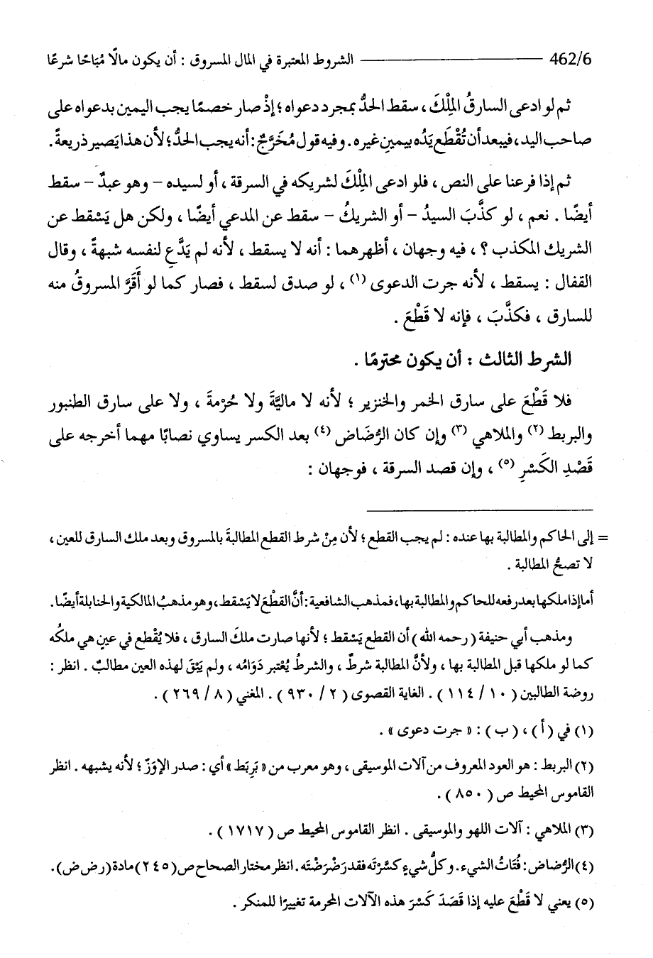 فَلَا قطع على سَارِق الْخمر وَالْخِنْزِير لِأَنَّهُ لَا مَالِيَّة وَلَا حُرْمَة وَلَا على سَارِق الطنبور والبربط والملاهي وَإِن كَانَ الرضاض بعد الْكسر يُسَاوِي نِصَابا مهما أخرجه على قصد الْكسر وَإِن قصد السّرقَة فَوَجْهَانِ