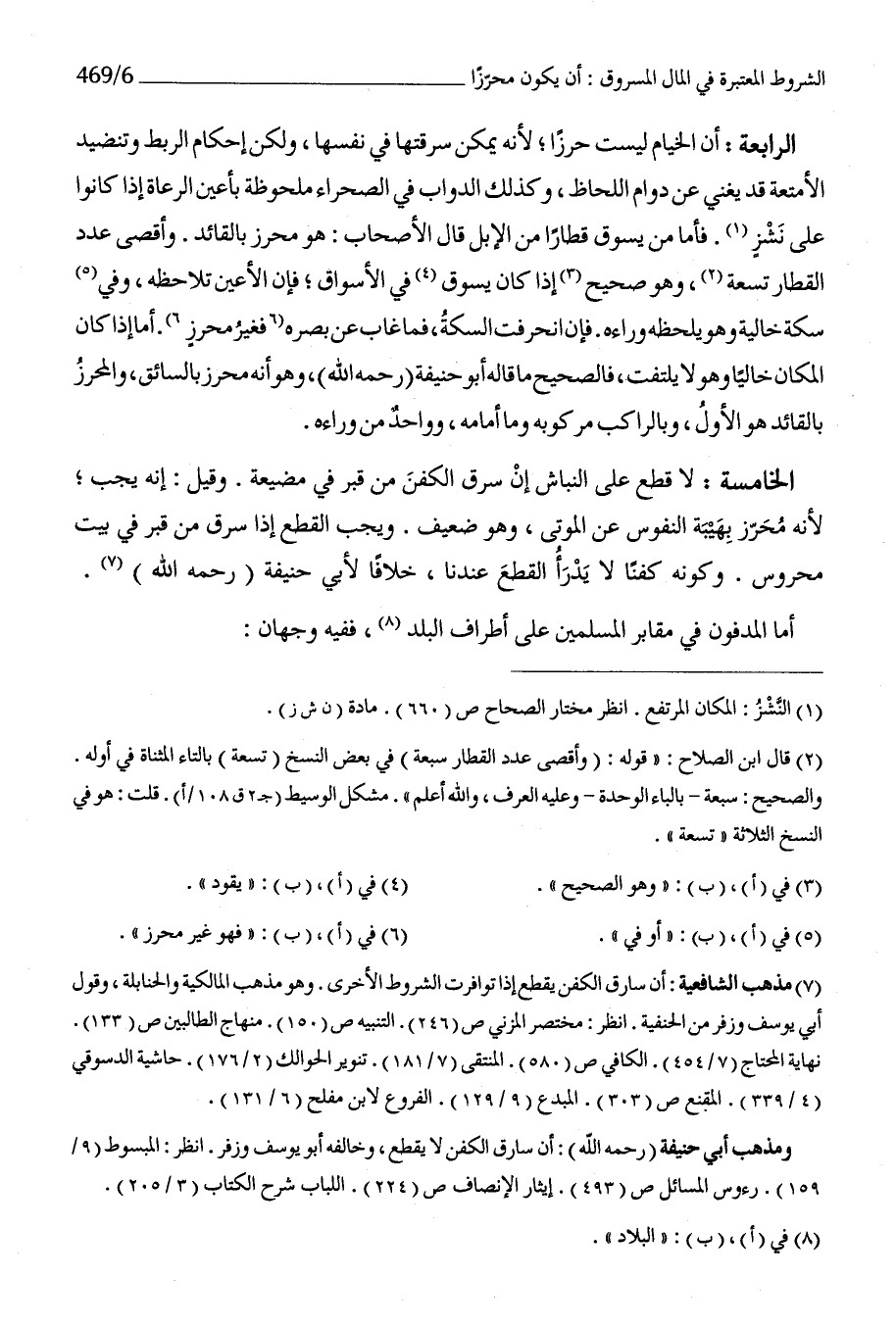 الْخَامِسَة لَا قطع على النباش إِن سرق الْكَفَن من قبر فِي مضيعة وَقيل إِنَّه يجب لِأَنَّهُ مُحرز بهيبة النُّفُوس عَن الْمَوْتَى وَهُوَ ضَعِيف وَيجب الْقطع إِذا سرق من قبر فِي بَيت محروس وَكَونه كفنا لَا يدْرَأ الْقطع عندنَا خلافًا لأبي حنيفَة رَحمَه الله