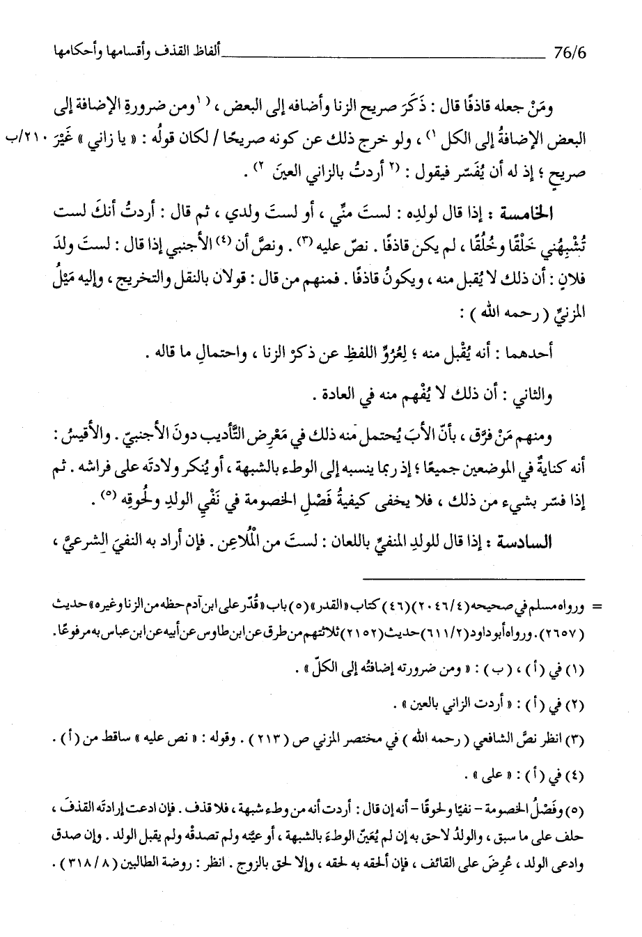 الْخَامِسَة إِذا قَالَ لوَلَده لست مني أَو لست وَلَدي ثمَّ قَالَ أردْت أَنَّك لست تشبهني خلقا وخلقا لم يكن قَاذِفا نَص عَلَيْهِ وَنَصّ أَن الْأَجْنَبِيّ إِذا قَالَ لست ولد فلَان أَن ذَلِك لَا يقبل مِنْهُ وَيكون قَاذِفا فَمنهمْ من قَالَ قَولَانِ بِالنَّقْلِ والتخريج وَإِلَيْهِ ميل الْمُزنِيّ رَحمَه الله