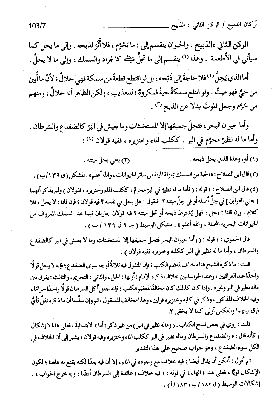الرُّكْن الثَّانِي الذَّبِيح وَالْحَيَوَان يَنْقَسِم إِلَى مَا يحرم فَلَا أثر لذبحه وَإِلَى مَا يحل كَمَا سَيَأْتِي فِي الْأَطْعِمَة وَهَذَا يَنْقَسِم إِلَى مَا تحل ميتَته كالجراد والسمك وَإِلَى مَا لَا يحل