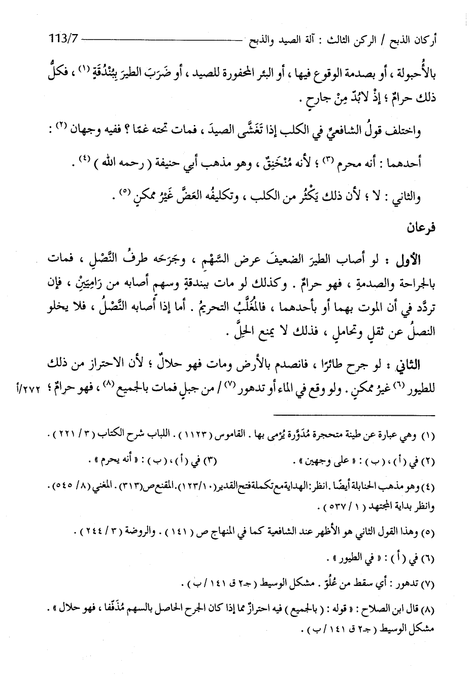 الأول لَو أصَاب الطير الضَّعِيف عرض السهْم وجرحه طرف النصل فَمَاتَ بالجراحة والصدمة فَهُوَ حرَام وَكَذَلِكَ لَو مَاتَ ببندقة وَسَهْم أَصَابَهُ من راميين فَإِن تردد فِي أَن الْمَوْت بهما أَو بِأَحَدِهِمَا فالمغلب التَّحْرِيم أما إِذا أَصَابَهُ النصل فَلَا يَخْلُو النصل عَن ثقل وتحامل فَذَلِك لَا يمْنَع الْحل